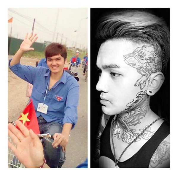 Kèm theo status dài đầy tâm huyết này, chàng trai tung lên Facebook ảnh chụp hình xăm lớn chiếm một nửa diện tích đầu và má phải của mình.