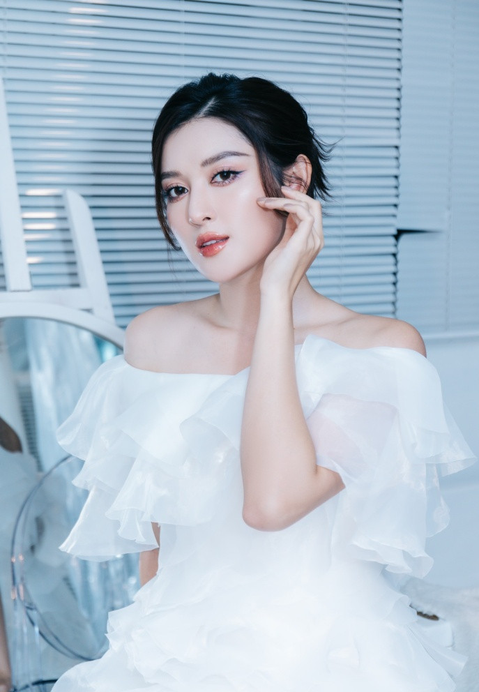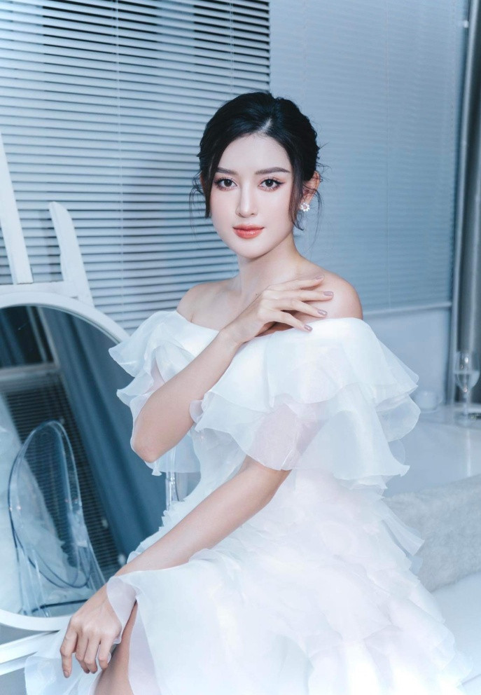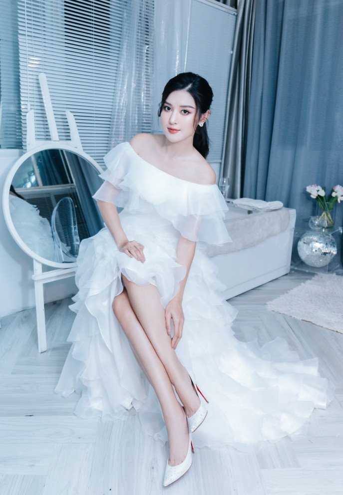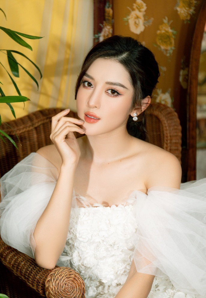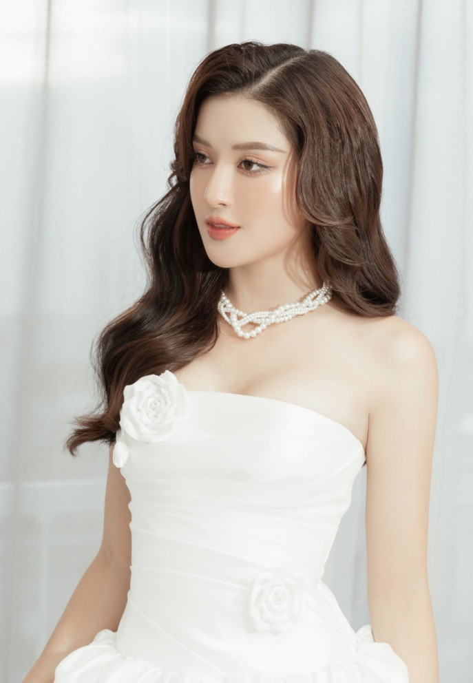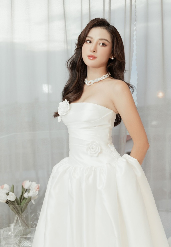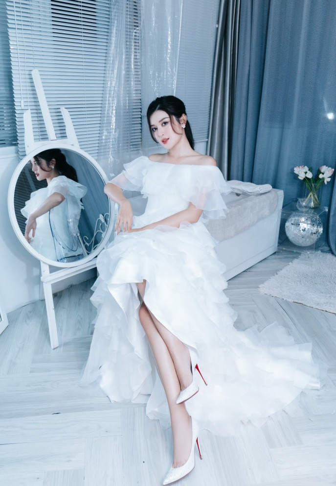 Những phụ kiện như dây chuyền, giày cũng mang màu trắng ton-sur-ton, hoàn thiện phần nhìn cho người đẹp. Phong cách ngọt ngào, nhẹ nhàng vốn là thế mạnh của á hậu trong suốt nhiều năm qua.
