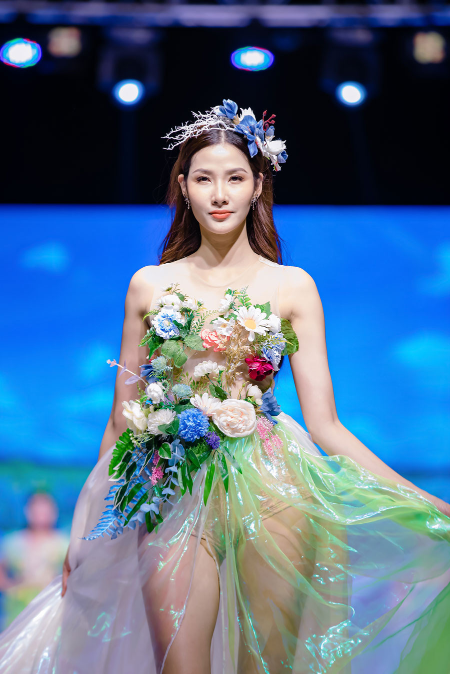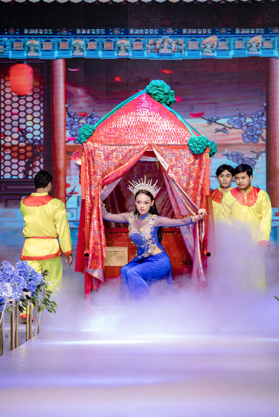 Á hậu Mai Ngô xuất hiện dịu dàng trong tà áo dài xanh, cô được rước kiệu lên sân khấu trình diễn, khác hẳn với vẻ cá tính thường thấy.