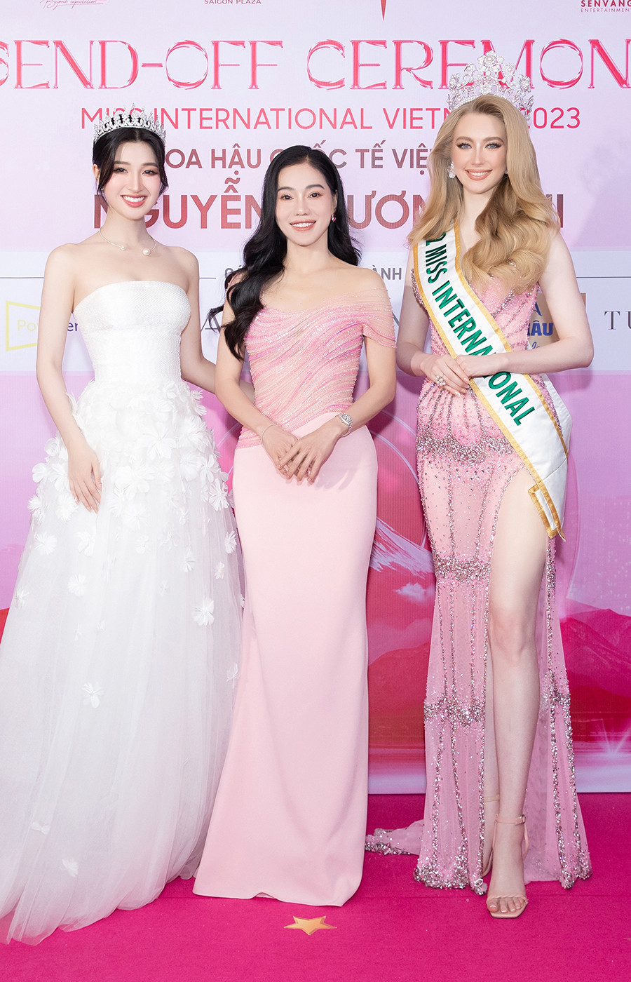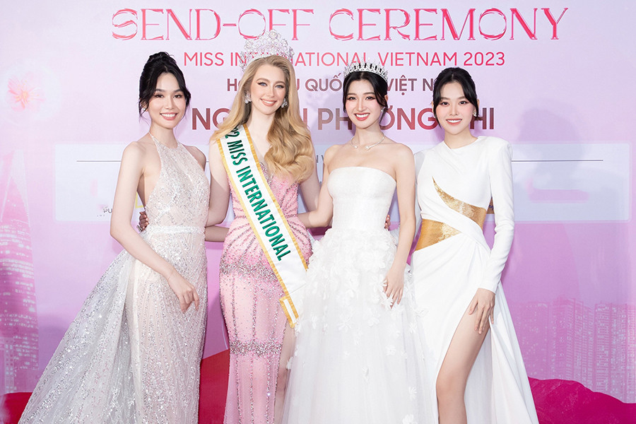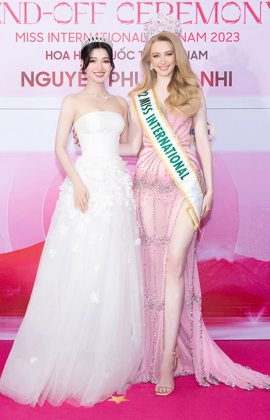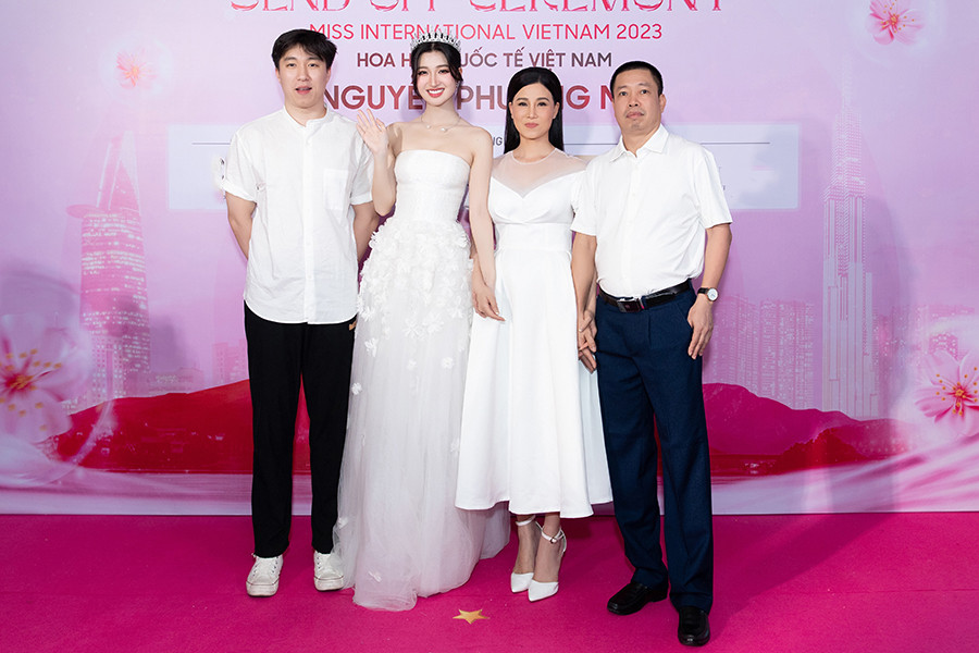 "Việc bảo lưu kết quả học tập là quá trình bàn bạc giữa gia đình, công ty và bản thân Phương Nhi. Chúng tôi thấy rằng việc Phương Nhi bảo lưu kết quả một năm để hoàn thiện các kỹ năng, chuẩn bị tốt nhất khi tham gia cuộc thi quốc tế là hợp lý. Sau khi em ấy giành ngôi vị á hậu, có nhiều điều tốt đẹp đã đến với sự nghiệp của Phương Nhi. Mọi thứ đang đi đúng quỹ đạo mà chúng tôi vạch ra. Sau khi kết thúc cuộc thi, em ấy sẽ trở lại trường", bà Phạm Kim Dung nói. Á hậu Thảo Nhi Lê diện trang phục trắng tôn dáng đến chung vui cùng Phương Nhi. Sự xuất hiện của Thảo Nhi cũng khiến đương kim Hoa hậu Quốc tế 2022 Jasmin Selberg thấy gần gũi khi cả hai cùng sinh sống và học tập tại Đức.Á hậu Tường San và á hậu Phương Anh rạng rỡ tại họp báo. Cả hai từng đại diện Việt Nam chinh chiến Hoa hậu Quốc tế nên có kinh nghiệm chia sẻ cùng Phương Nhi.