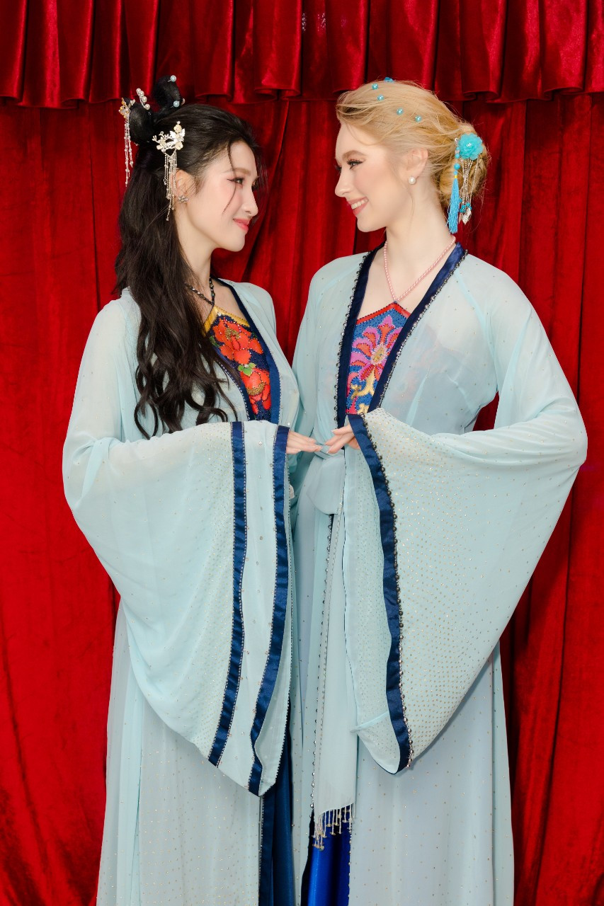 Hai nàng hậu đã được thưởng thức tiết mục cải lương đặc sắc và hóa thân thành hai nhân vật nổi tiếng - Thúy Kiều, Thúy Vân.