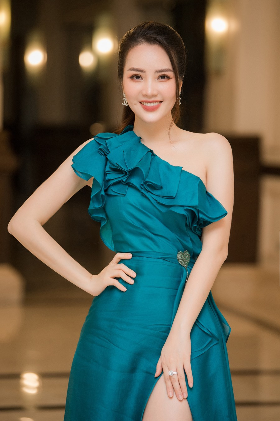 Mới đây nhất, á hậu Thuỵ Vân xuất hiện tại sự kiện quảng bá du lịch Nghệ An. Về với miền Trung đầy nắng gió, á hậu Thuỵ Vân lựa chọn chiếc váy màu xanh cổ vịt tôn lên làn da trắng. Chiếc váy lệch vai, xẻ tà cao đã khoe trọn được vóc dáng lý tưởng, đôi chân dài miên man của cô.