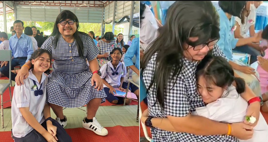 Những hình ảnh lan truyền cho thấy con gái Nong Cream đang ôm chặt bố, tỏ lòng kính trọng, yêu thương bố. Cô cho biết trang phục của bố mình trong ngày hôm đó thật đẹp và dễ thương.