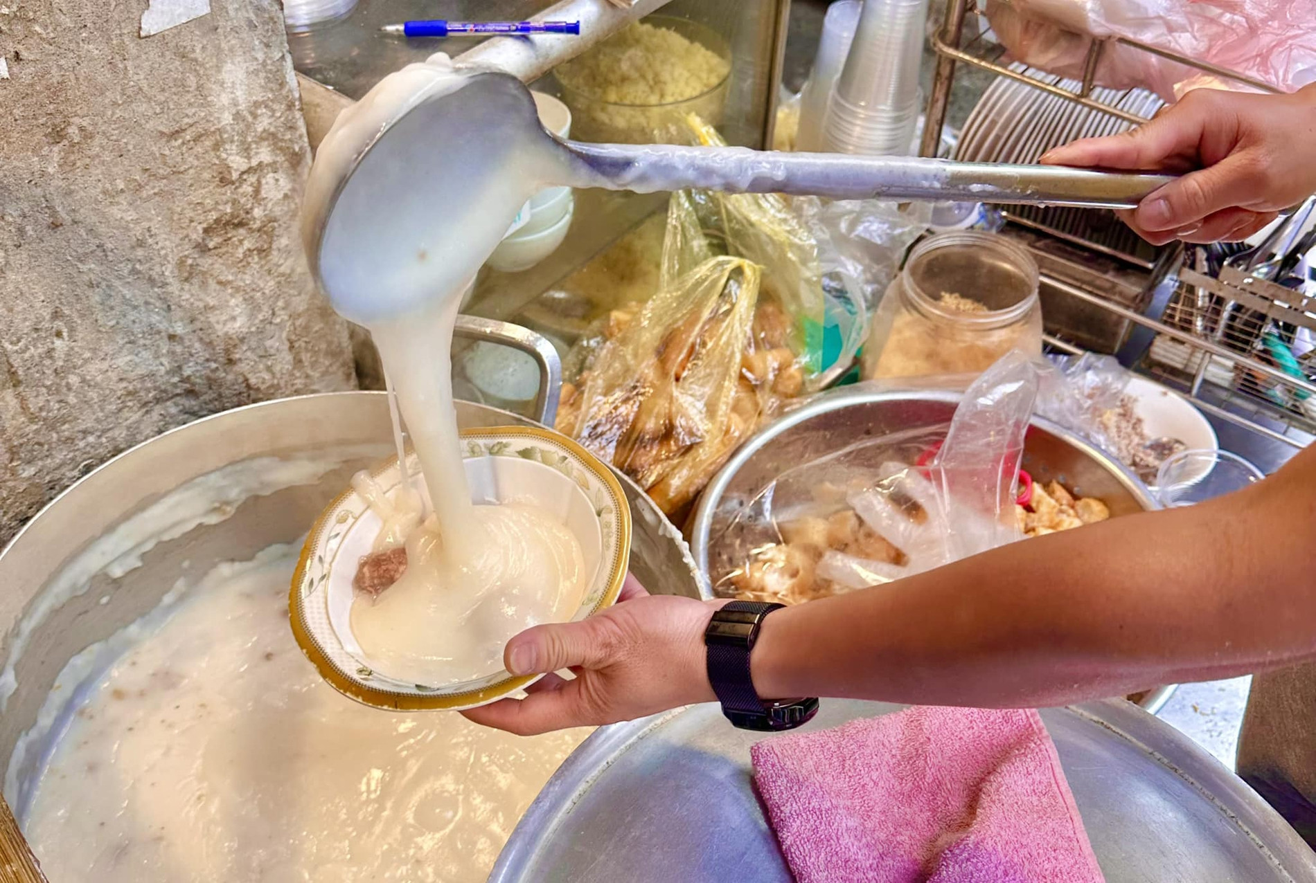 Điều đặc biệt là quán sử dụng cối đá hàng chục năm tuổi để xay bột thay vì dùng cối xay công nghiệp như nhiều nơi khác. Cách làm này giúp bột xay mịn, thơm hơn, bánh cuốn hấp lên cũng có độ mỏng, mềm dẻo và hơi dai.