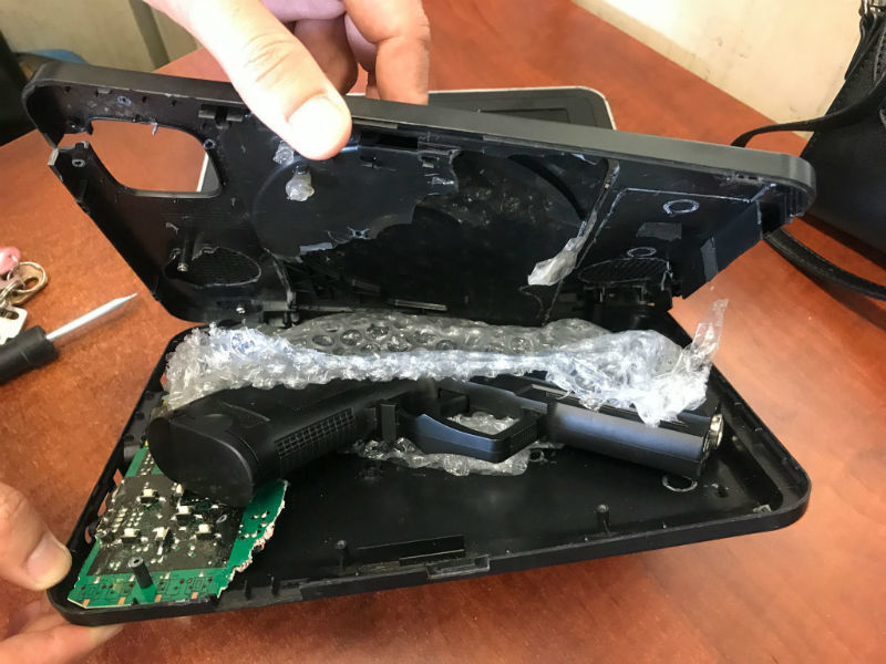 Kiểm tra 1 kiện hàng trong số kiện hàng gửi qua đường không, lực lượng an ninh sân bay phát hiện súng đạn được cất giấu tinh vi bằng thủ đoạn mới, lạ.