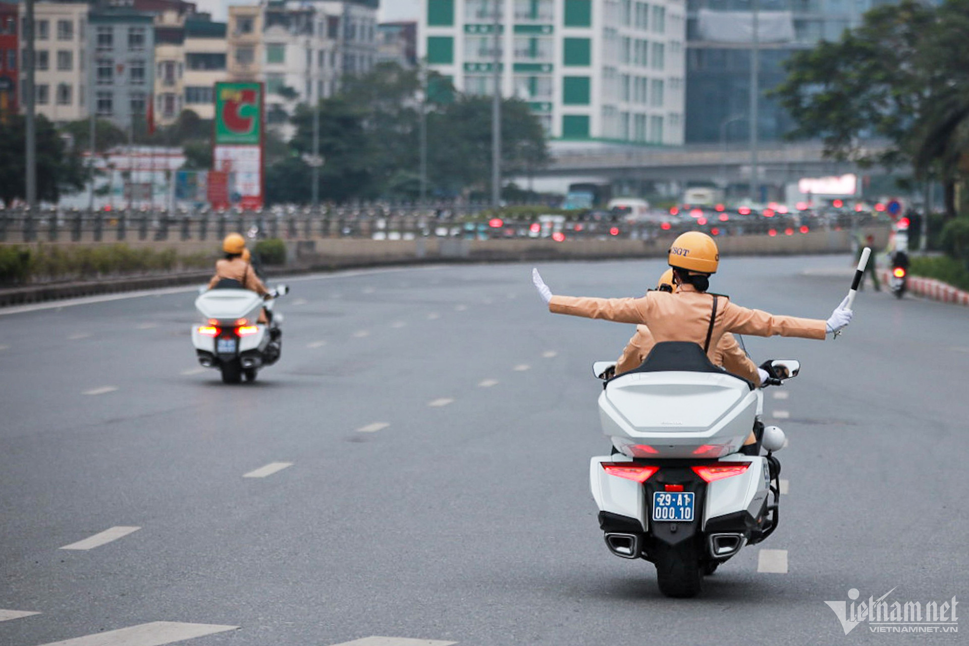 Đại tá Trần Đình Nghĩa - Trưởng Phòng CSGT Công an TP Hà Nội cho biết, xe dẫn đoàn được lựa chọn làm nhiệm vụ là Honda GoldWing 2023 thế hệ mới nhất, hiện đại nhất do Cục CSGT (Bộ Công an) vừa trang cấp.