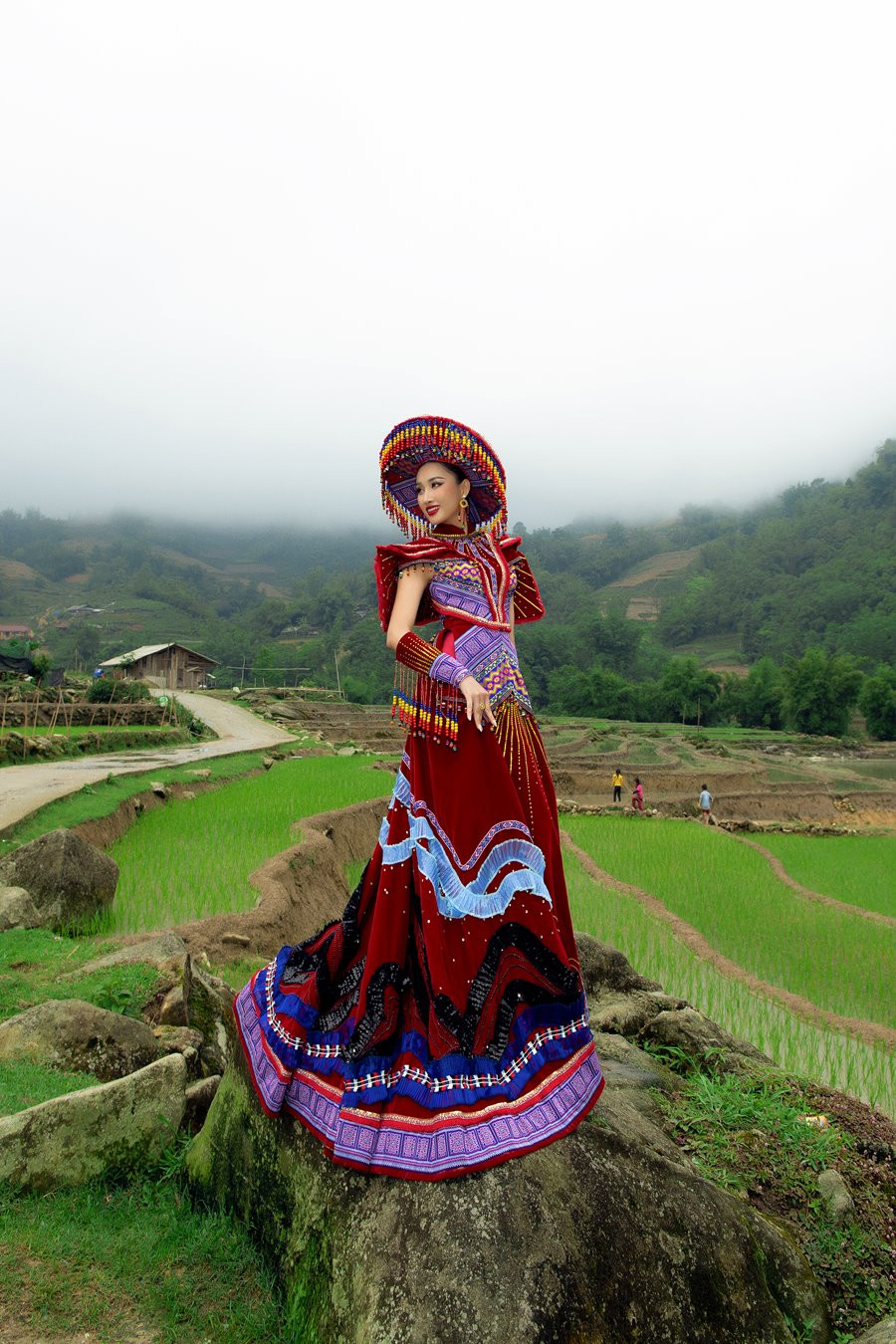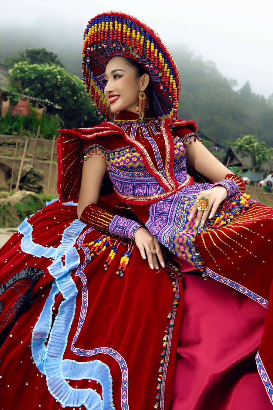 Bộ trang phục dân tộc dự thi Miss Global International 2022 của Đoàn Hồng Trang có tên là “Hợp sắc liên toả” do NTK Nguyễn Minh Tuấn thiết kế cùng với sự đồng hành ý tưởng của chính Đoàn Hồng Trang. Có thể thấy “Hợp sắc liên toả” mang đậm dấu ấn văn hoá của các dân tộc vùng cao phía Bắc. Theo NTK Nguyễn Minh Tuấn, “Hợp sắc liên toả” được thiết kế dựa trên màu sắc, hoạ tiết và nền văn hoá đa dạng của các dân tộc anh em Việt Nam, đặc biệt có điểm nhấn nổi bật là trang phục người H'Mông kết hợp tinh tế, nhuần nhuyễn với hình ảnh duyên dáng của áo dài Việt Nam, nổi bật lộng lẫy nhờ sắc nhung đỏ, phần cầu vai ấn tượng mang đến một sự kiêu sa và vô cùng uy quyền mà vẫn thể hiện được trọn vẹn vẻ đẹp văn hoá truyền thống. Trang phục được chăm chút tỉ mỉ đến từng đường may, từng đường đính kết công phu do các nghệ nhân đính kết thực hiện trong nhiều giờ với hàng nghìn viên đá pha lê làm nổi bật lên giá trị bản sắc văn hoá, con người của các dân tộc Việt Nam mà Đoàn Hồng Trang muốn giới thiệu đến với bạn bè quốc tế. Phần tà xoè rộng với những đường hoạ tiết uốn lượn gợi tả vẻ đẹp núi non hùng vĩ bao quanh không chỉ giúp cảm nhận rõ một phần vẻ đẹp của vùng cao Việt Nam mà theo NTK Nguyễn Minh Tuấn, nó còn là sự biểu đạt cho sự bảo bọc, chở che của thiên nhiên tươi đẹp đối với người Việt, biểu đạt cho sự gắn kết, yêu thương, đùm bọc lẫn nhau giữa các dân tộc. Đoàn Hồng Trang chia sẻ, cô rất tự hào khi được đem trang phục này giới thiệu tại Miss Global International 2022. Như đã từng nói, lần này đến với Miss Global International 2022, Đoàn Hồng Trang không chỉ có nhiệm vụ nỗ lực giành chiến thắng mà cô còn tự nhận lấy một sứ mệnh đóng góp sức nhỏ của mình vào việc quảng bá vẻ đẹp đất nước, con người Việt Nam“Sau khi trải qua đại dịch Covid-19, được chứng kiến những yêu thương, chia sẻ hết lòng của mỗi người dân Việt dành cho nhau để cùng nhau bước qua khó khăn, chiến thắng đại dịch; Sau khi theo dõi những chiến thắng vang dội của Đoàn thể thao Việt Nam tại SEA Games 31 với nỗ lực to lớn, không quản ngại hy sinh vì màu cờ sắc áo của các VĐV Việt Nam… tôi cũng như những người dân Việt Nam khác đều dâng lên niềm tự hào dân tộc mãnh liệt trong trái tim mình", Đoàn Hồng Trang nói. "Dự thi Miss Global International 2022 là cơ hội quý giá để tôi được đóng góp sức nhỏ của mình vào việc quảng bá những điều tuyệt vời của đất nước mình đến với bạn bè quốc tế. Tôi muốn được giới thiệu với bạn bè quốc tế về vẻ đẹp đất nước, con người và đặc biệt là về trái tim nồng hậu, ấm áp cùng sự đoàn kết, đùm bọc yêu thương nhau giữa các dân tộc Việt Nam. Tôi sẽ đem niềm tự hào dân tộc biến thành động lực để “chinh chiến” hết mình vì màu cờ sắc áo", cô chia sẻ thêm.Đoàn Hồng Trang cho biết, cô không chỉ muốn quảng bá vẻ đẹp văn hoá đặc sắc của các dân tộc Việt Nam thông qua ý nghĩa trang phục với bạn bè quốc tế, mà với chính cả công chúng quê nhà. Vì lý do đó nên trước khi lên đường sang Bali, Indonesia dự thi, cô đã đầu tư cùng ekip đến Sapa chụp ảnh trang phục dân tộc. Tuy nhiên, khá không may mắn là ekip tới Sapa đúng thời điểm mưa triền miên, buộc phải di chuyển xuống vùng thấp hơn để chụp trong điều kiện thời tiết xấu. Đoàn Hồng Trang cho biết, để hoá giải điều không may mắn này, cô sẽ quyết tâm thực hiện thật tốt ở phần chụp hình trang phục dân tộc tại Miss Global 2022.