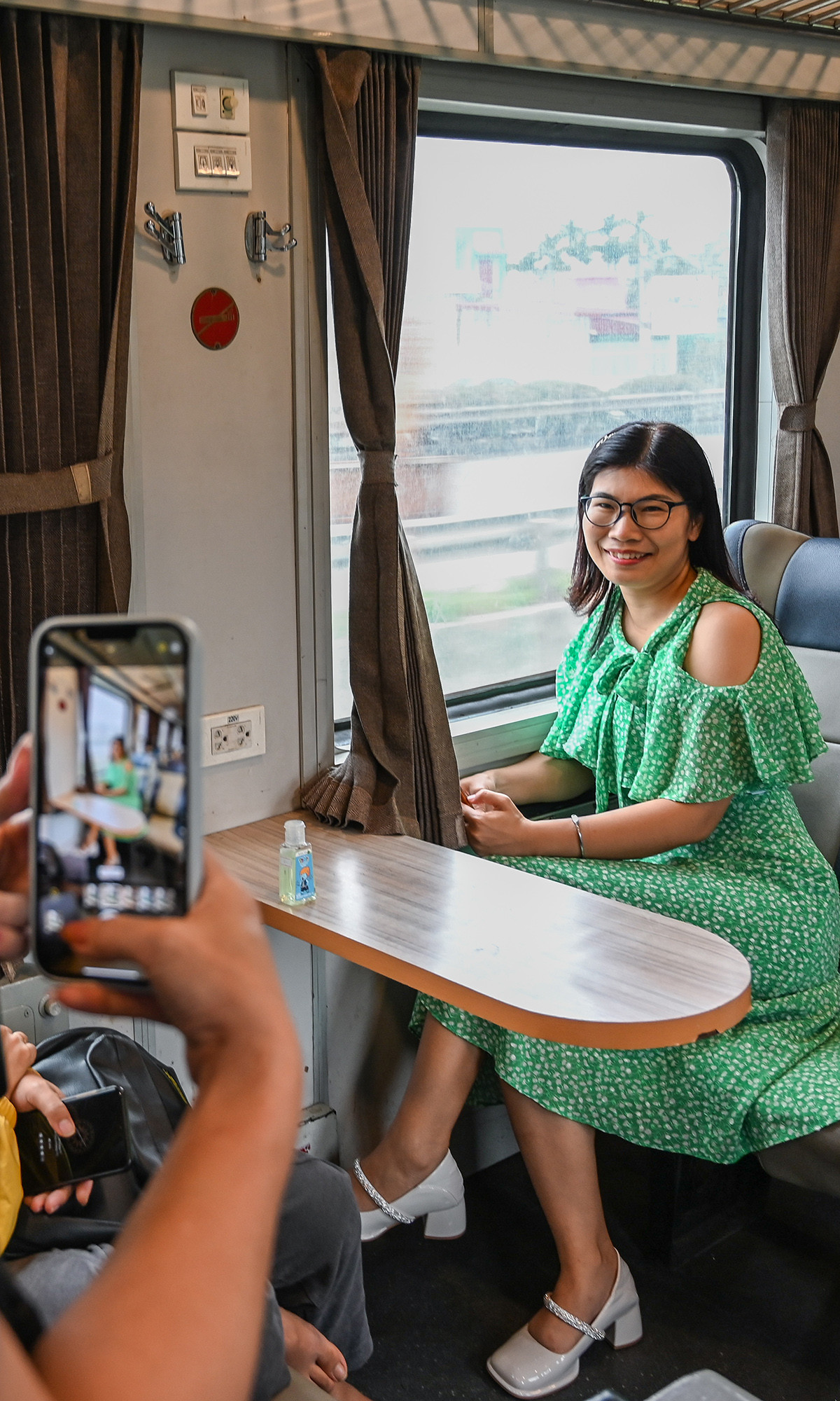 Thời gian di chuyển khoảng 2 tiếng, ai cũng tỏ ra háo hức. Cũng đi trải nghiệm food tour như nhóm bạn trẻ, chị Trang (Hà Nội) và bạn không quên check-in trên tàu. “Hải Phòng là điểm đến gần, dễ di chuyển trong ngày, rủ bạn bè đến đổi gió hẹn hò ăn uống, trò chuyện, ngồi cà phê là một trải nghiệm rất khác biệt”, nữ hành khách chia sẻ.