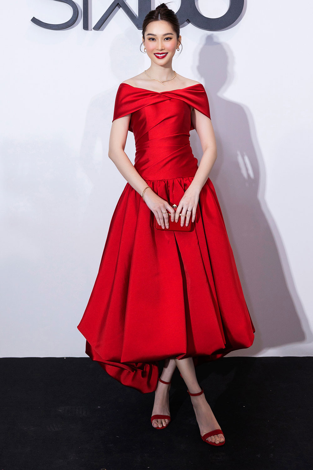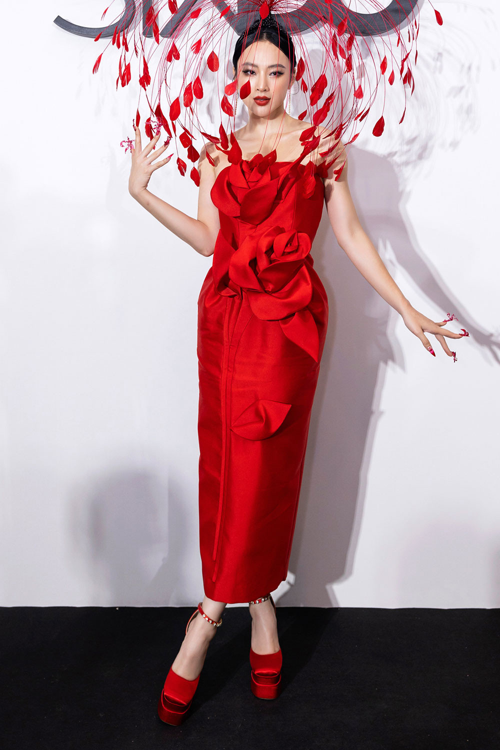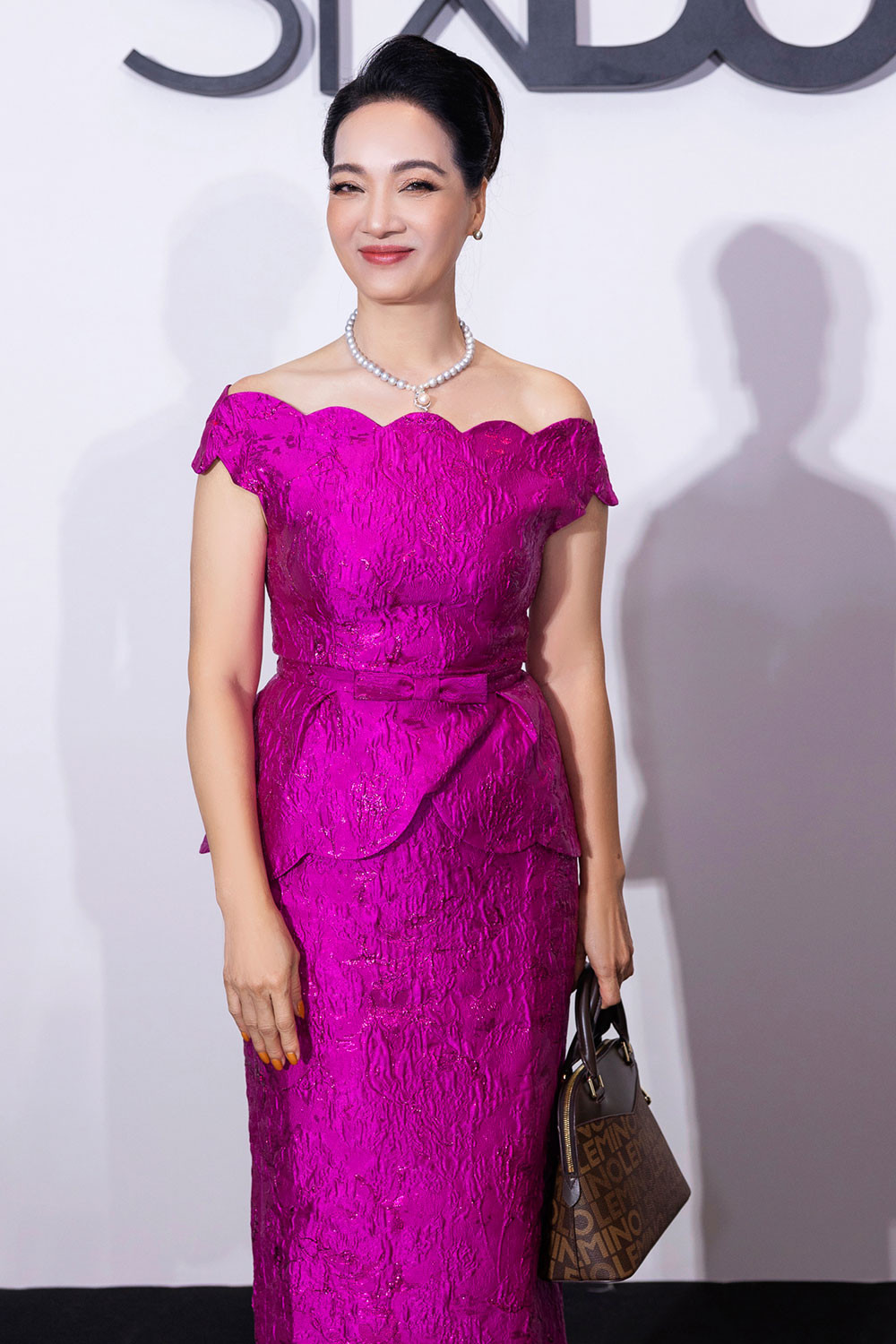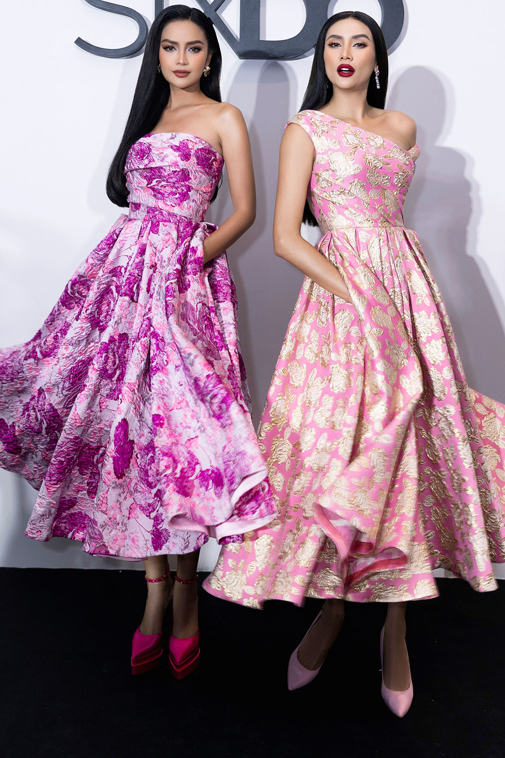 Á hậu Võ Hoàng Yến điệu đà với váu chéo vai, làm bằng vải gấm với tông hồng vàng sang trọng sánh đôi cùng Hoa hậu Ngọc Châu. NSND Lê Khanh lựa chọn bộ cánh hồng có phom dáng cổ điển với đường chiết eo vừa vặn, tôn lên hình thể cân đối của nữ nghệ sĩ. Angela Phương Trinh lựa chọn mẫu váy có phom dáng cổ điển, với điểm nhấn hình ảnh hoa trà ở ngực phủ nửa trên thân váy, dễ dàng tạo ấn tượng trong mắt người đối diện.