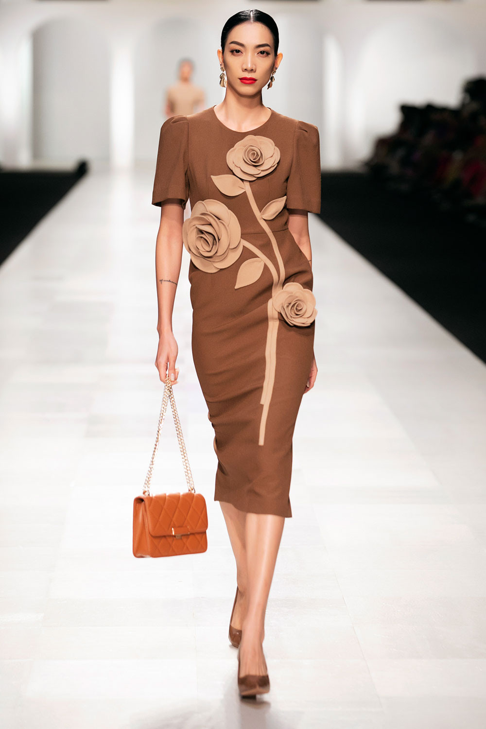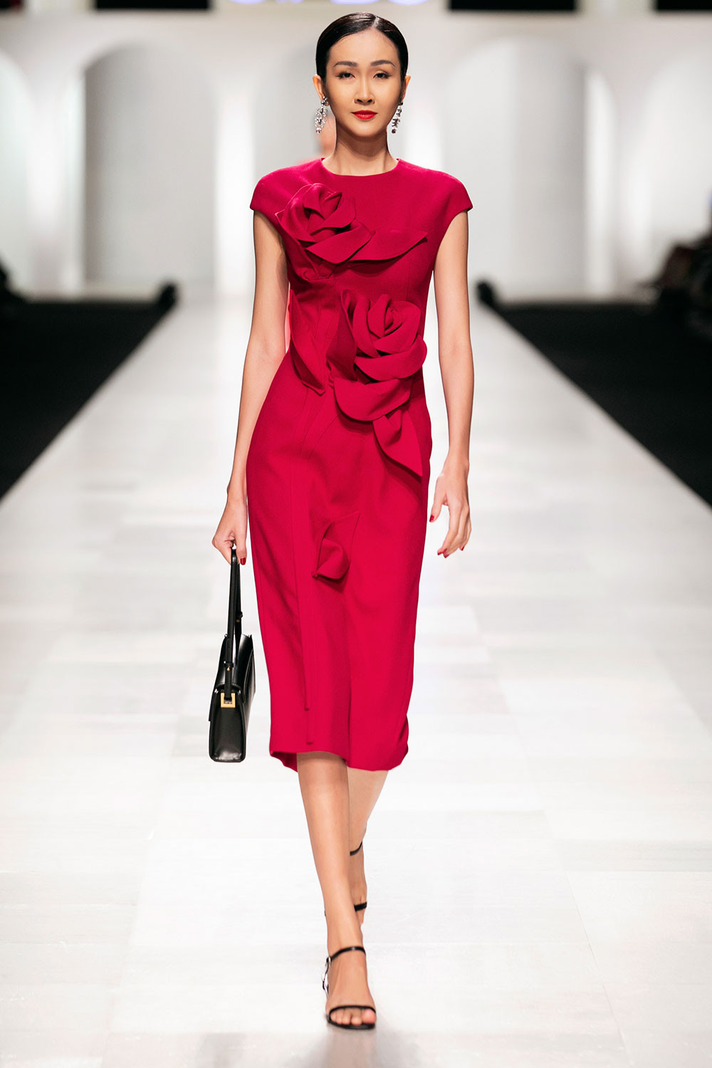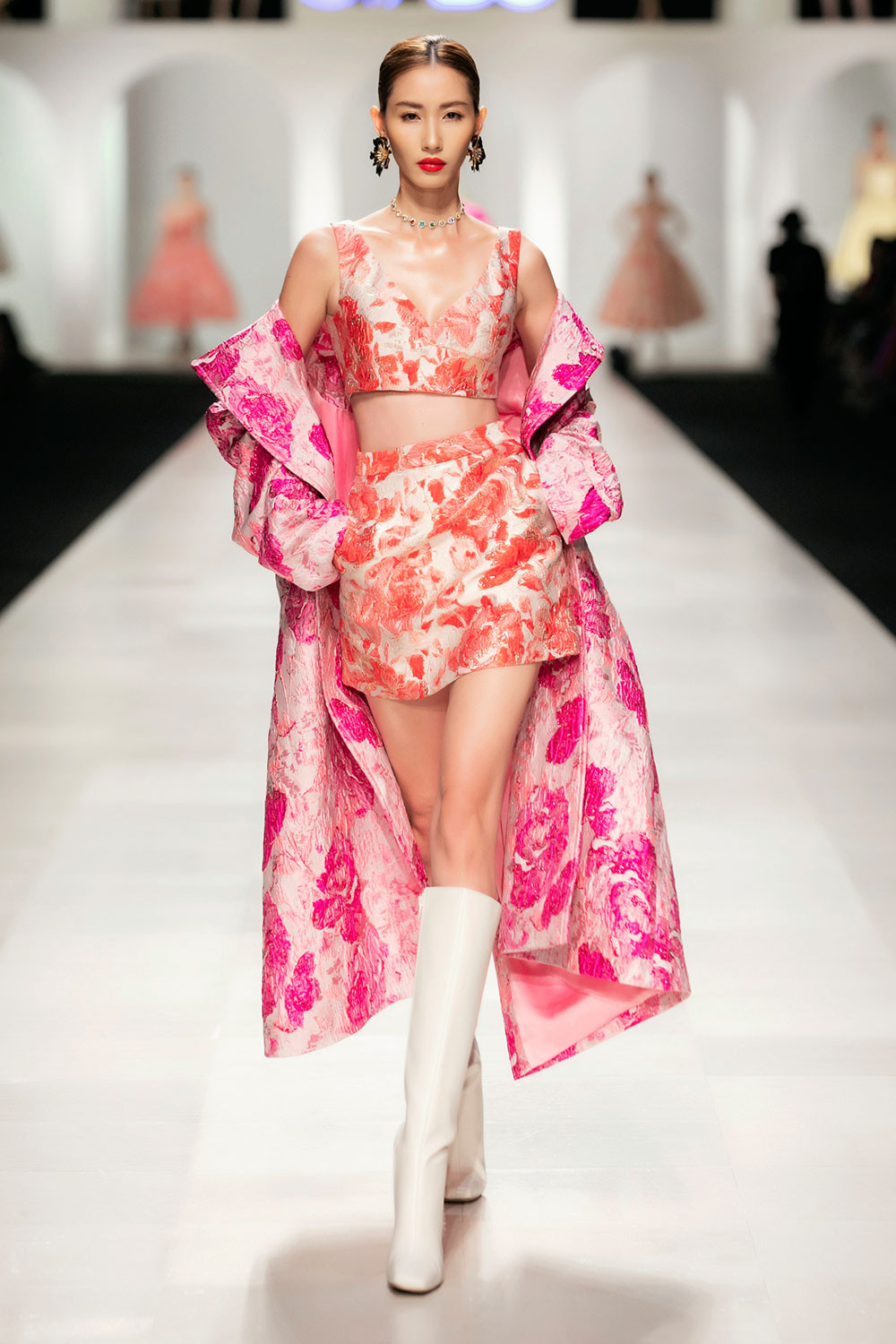 Á hậu Võ Hoàng Yến điệu đà với váu chéo vai, làm bằng vải gấm với tông hồng vàng sang trọng sánh đôi cùng Hoa hậu Ngọc Châu. NSND Lê Khanh lựa chọn bộ cánh hồng có phom dáng cổ điển với đường chiết eo vừa vặn, tôn lên hình thể cân đối của nữ nghệ sĩ. Angela Phương Trinh lựa chọn mẫu váy có phom dáng cổ điển, với điểm nhấn hình ảnh hoa trà ở ngực phủ nửa trên thân váy, dễ dàng tạo ấn tượng trong mắt người đối diện.