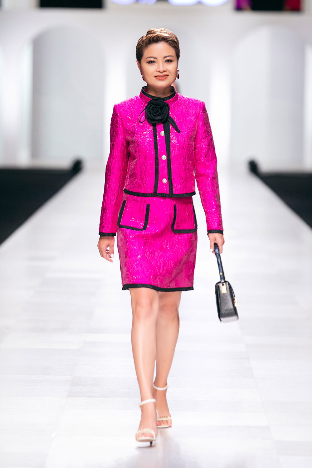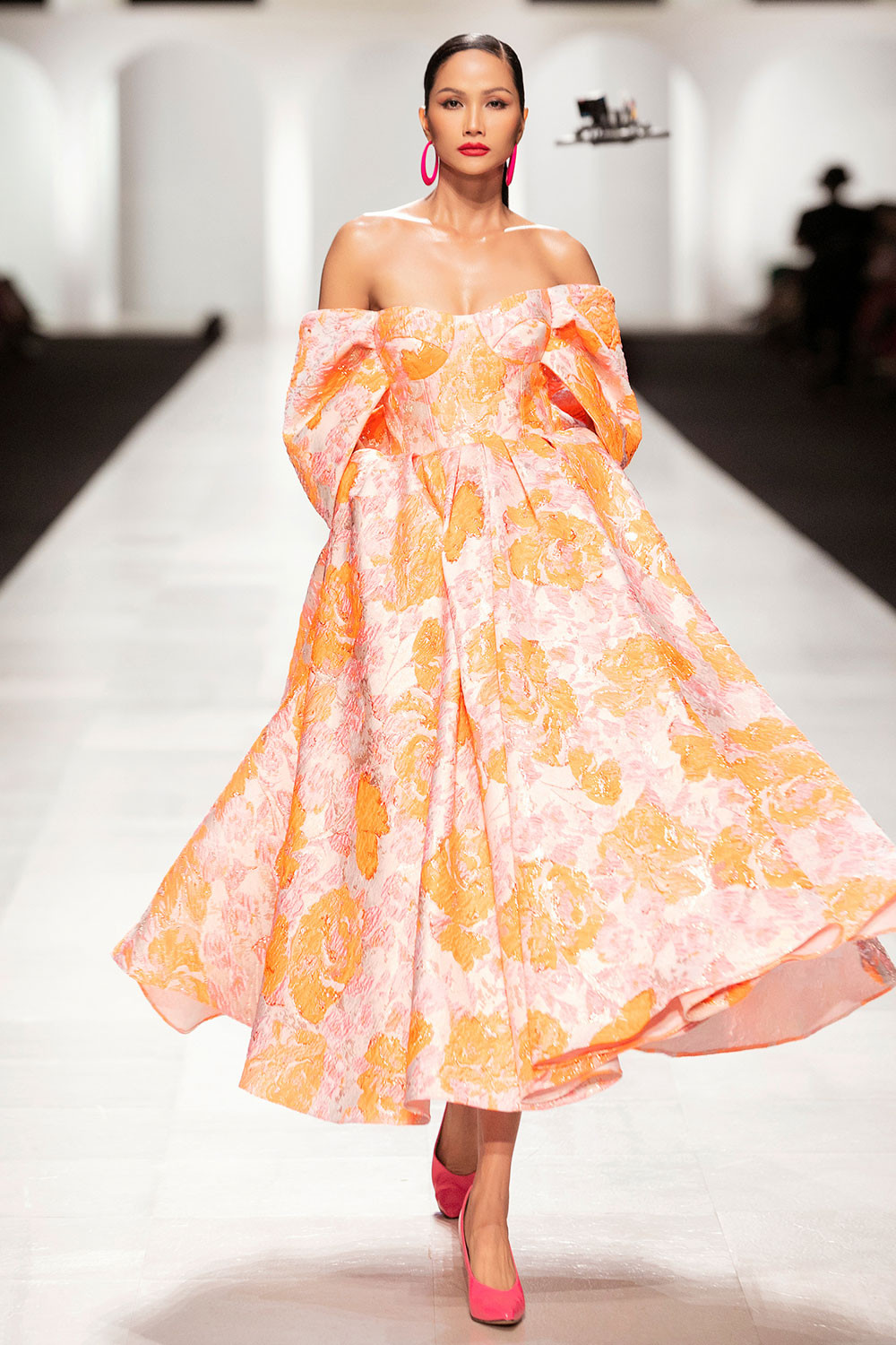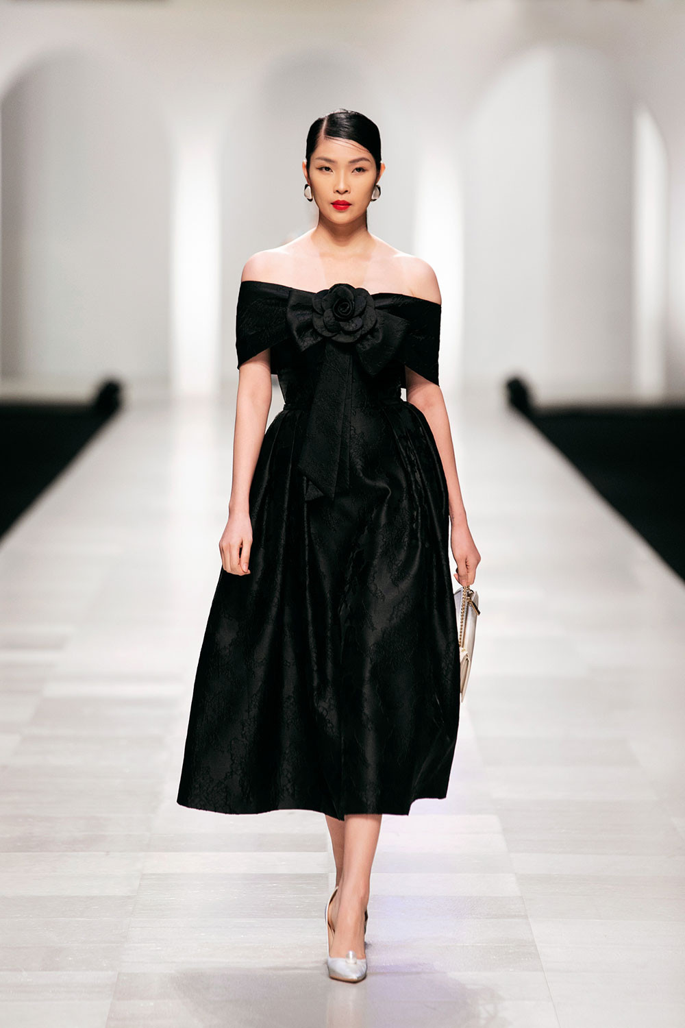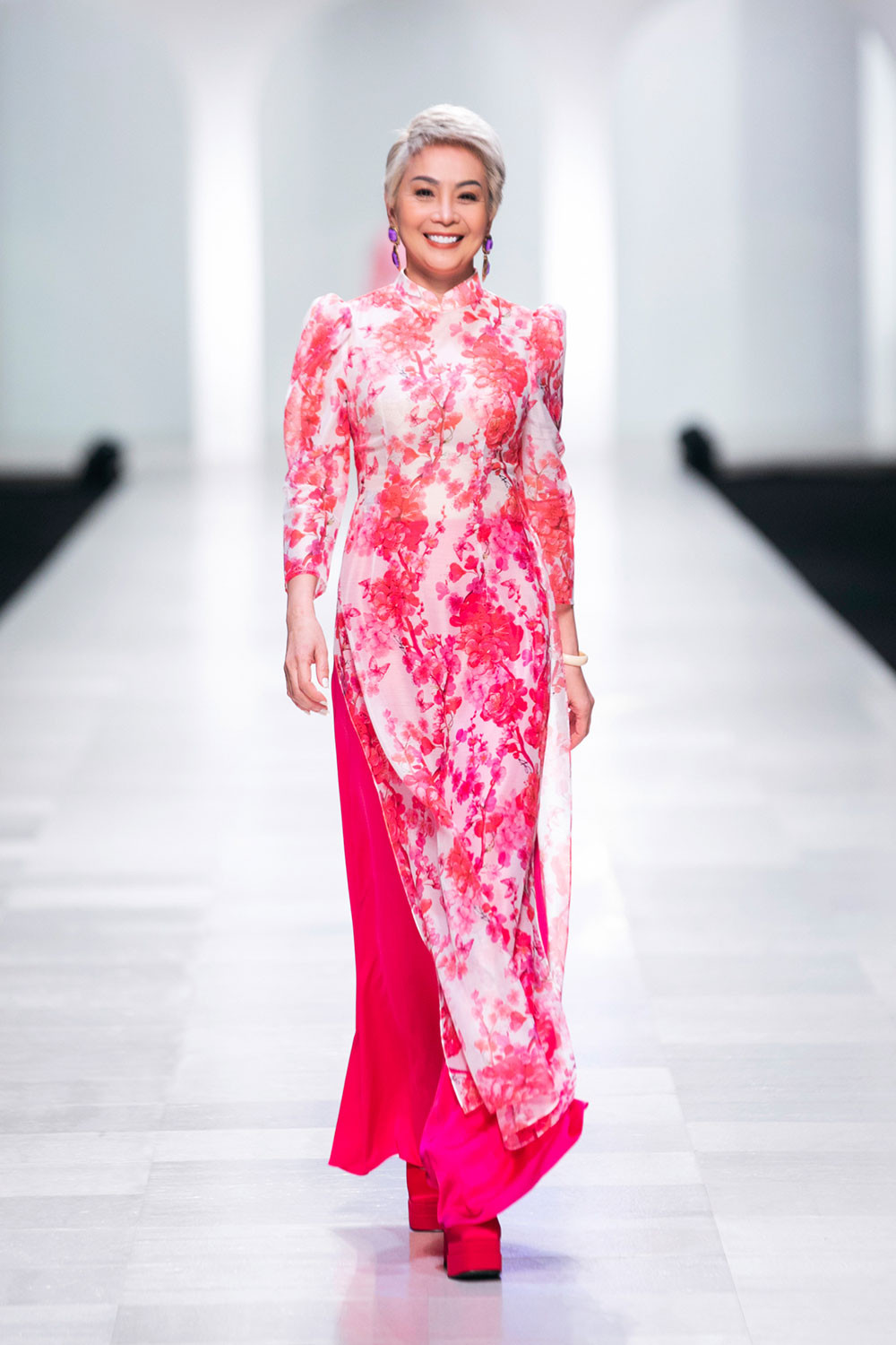 Á hậu Võ Hoàng Yến điệu đà với váu chéo vai, làm bằng vải gấm với tông hồng vàng sang trọng sánh đôi cùng Hoa hậu Ngọc Châu. NSND Lê Khanh lựa chọn bộ cánh hồng có phom dáng cổ điển với đường chiết eo vừa vặn, tôn lên hình thể cân đối của nữ nghệ sĩ. Angela Phương Trinh lựa chọn mẫu váy có phom dáng cổ điển, với điểm nhấn hình ảnh hoa trà ở ngực phủ nửa trên thân váy, dễ dàng tạo ấn tượng trong mắt người đối diện.