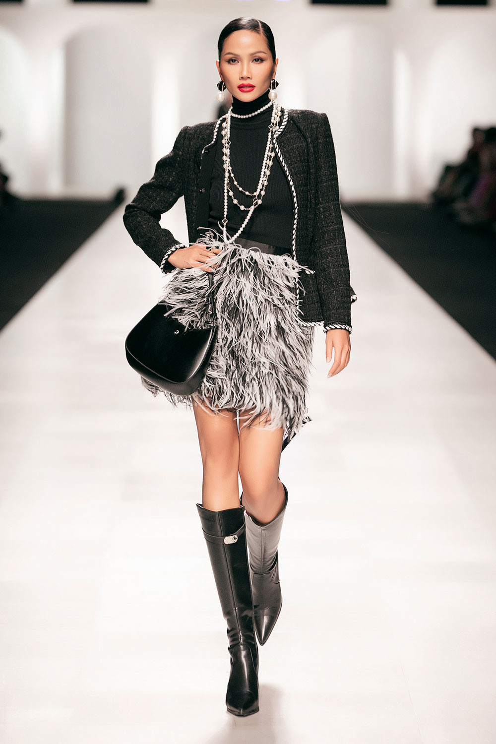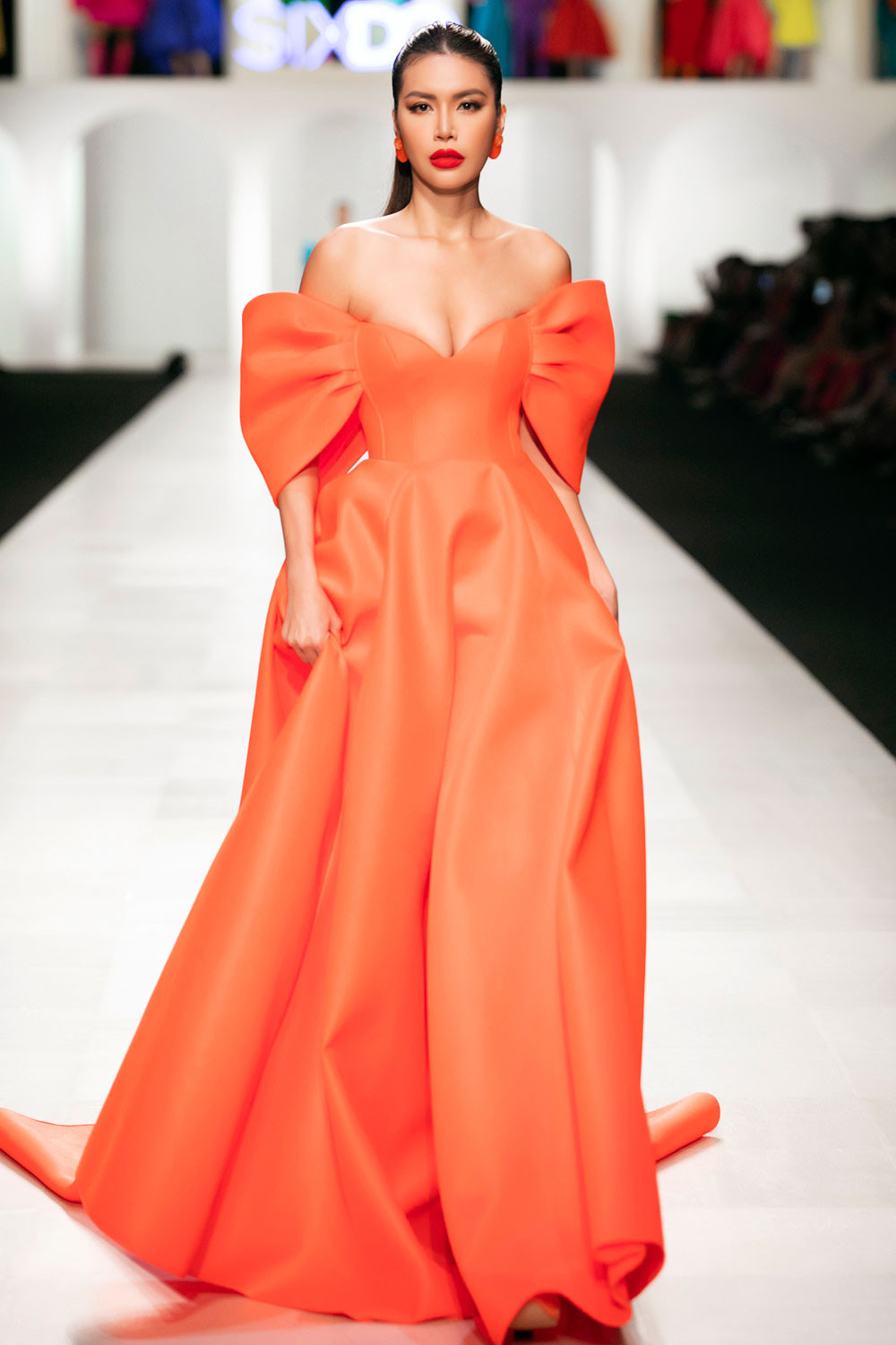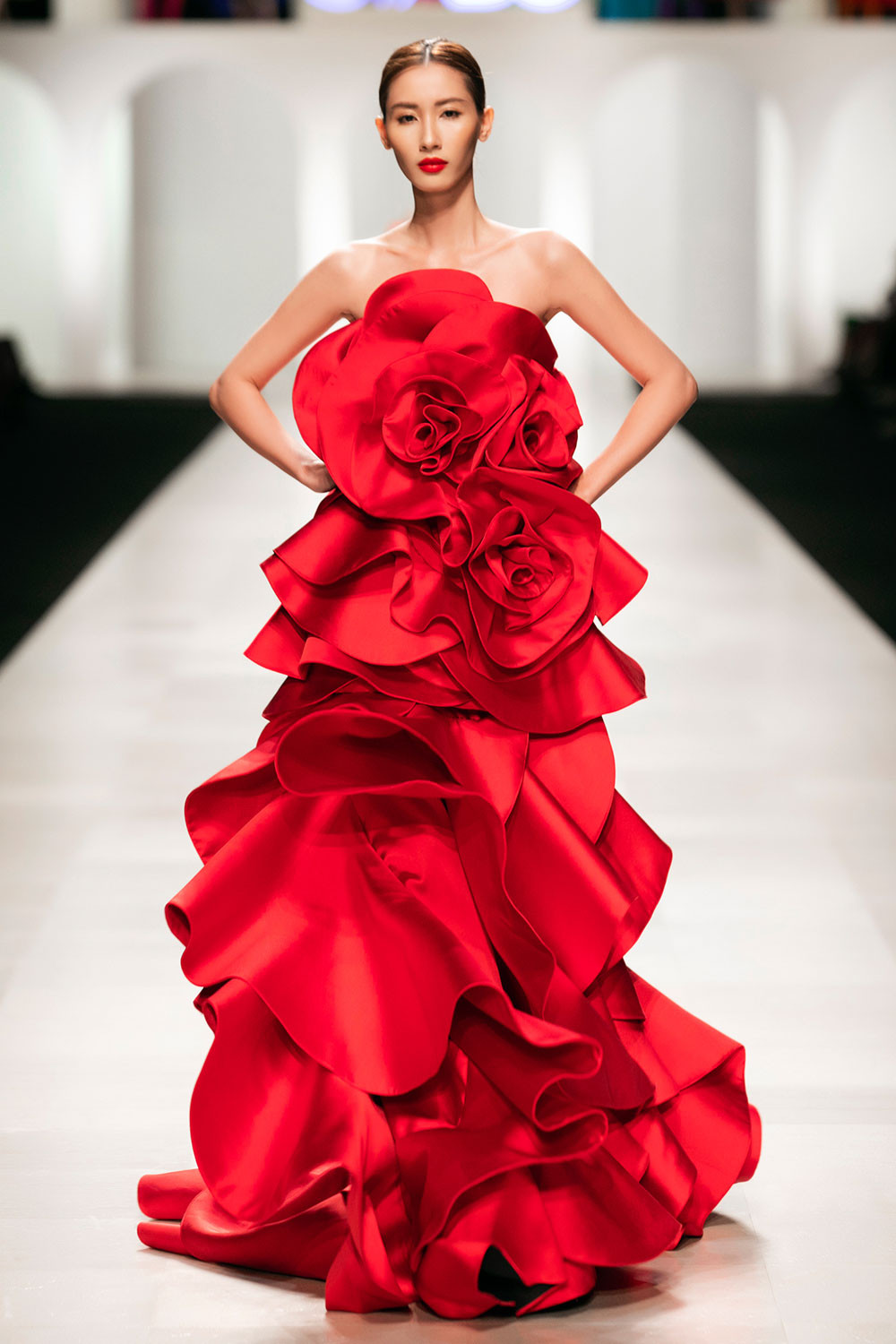 Hoa hậu Việt Nam 2012 Đặng Thu Thảo cũng hiếm khi xuất hiện tại các sự kiện từ khi lập gia đình. Tại show diễn, người đẹp diện thiết kế màu đỏ rực rỡ. Á hậu Mâu Thuỷ đang trong thai kỳ. Người đẹp diện đầm ôm sát, kết hợp hai tông màu cam, xanh thời thượng. Ca sĩ Hoàng Yến Chibi tươi trẻ trong mẫu váy phối cùng áo crop top.