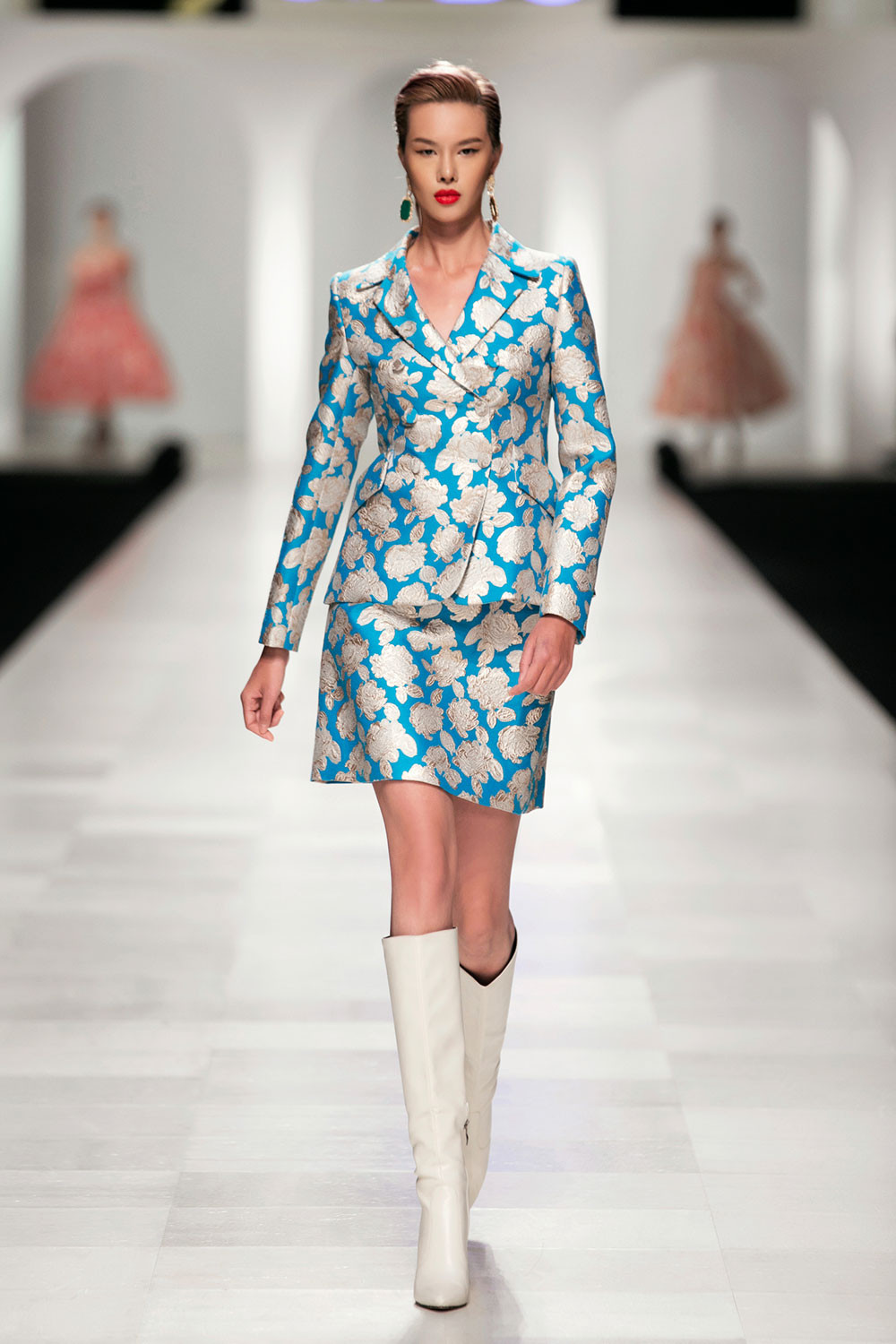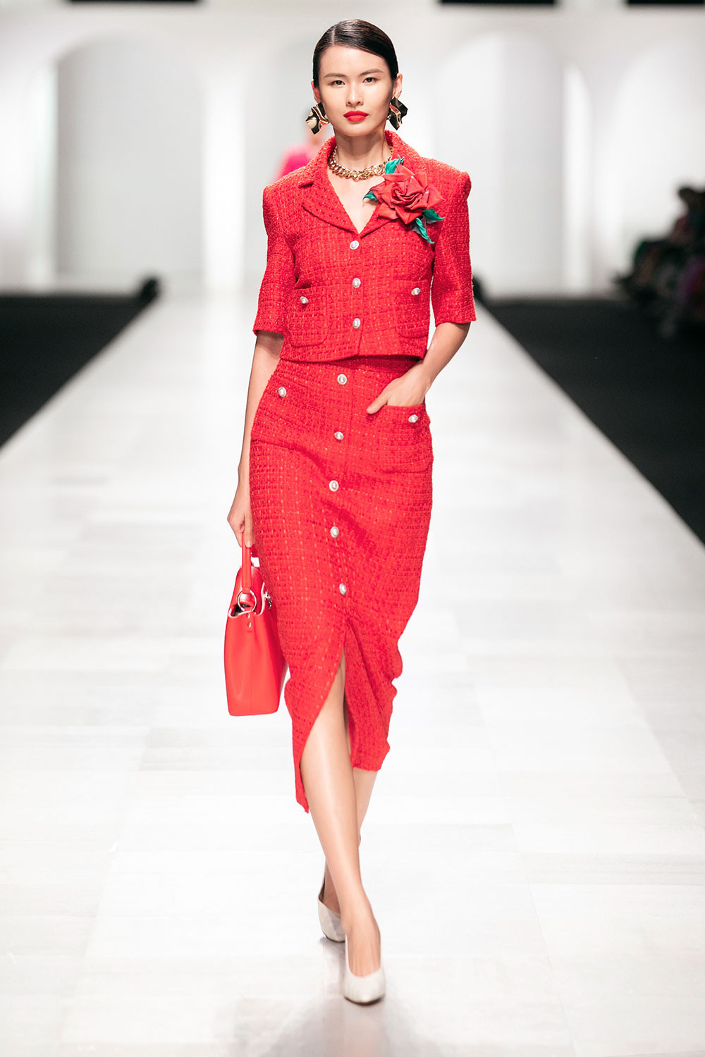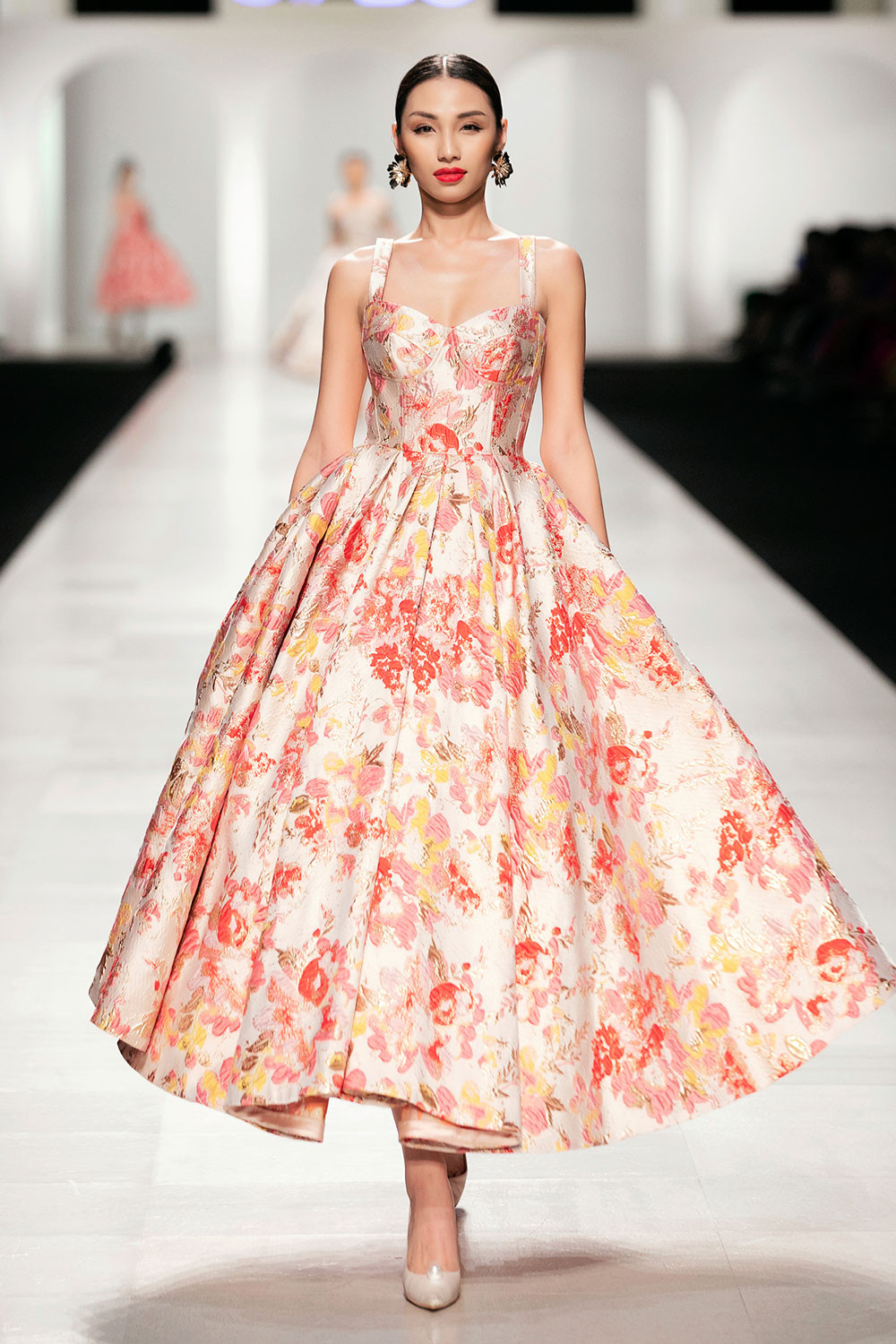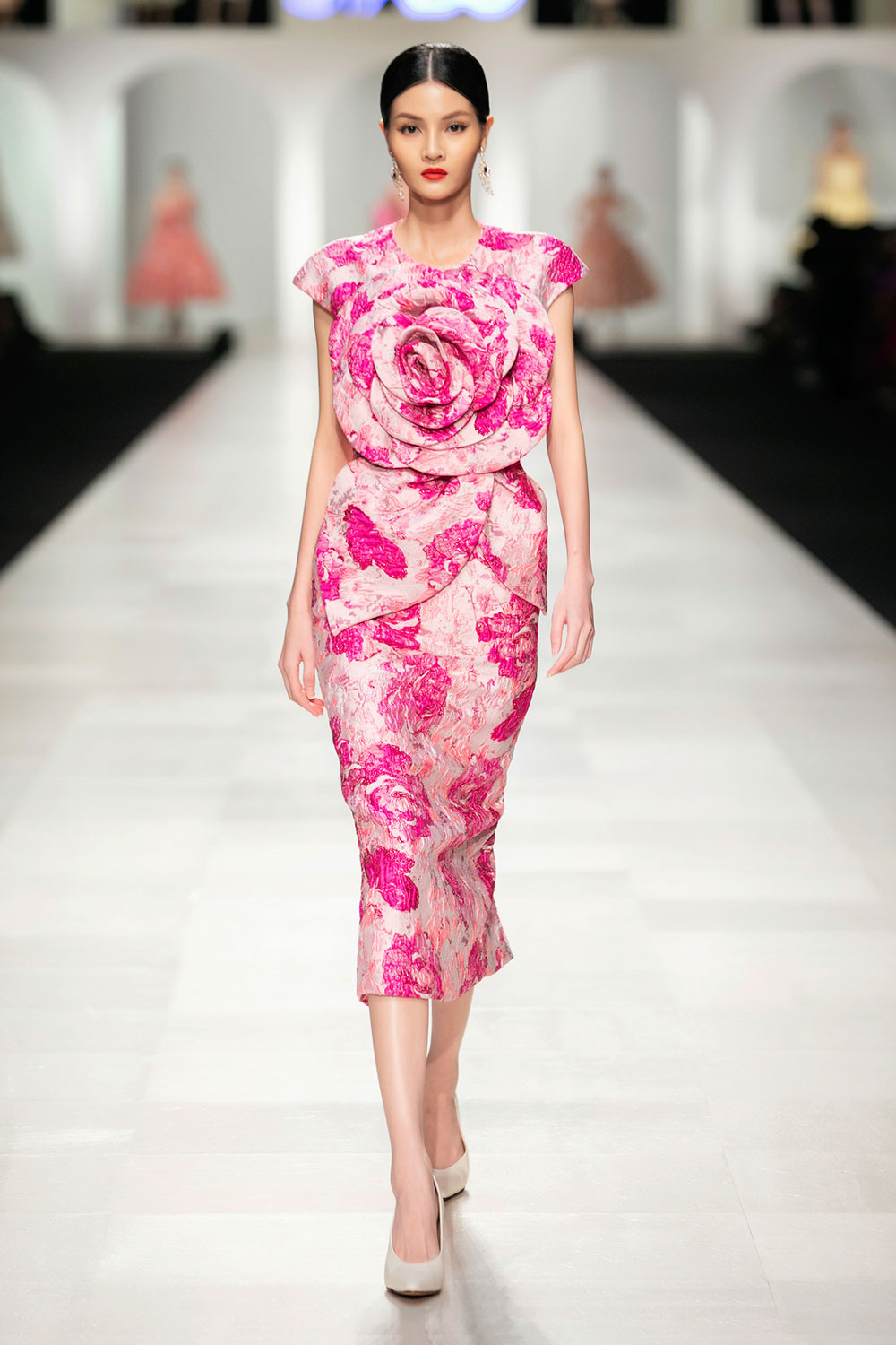 Phần 1 của BST là những thiết kế được thực hiện trên vải gấm. Màu sắc, hoạ tiết được NTK sản xuất riêng, độc quyền có thể phục vụ nhu cầu đa dạng của người mặc: đi làm, đi chơi, đi tiệc.