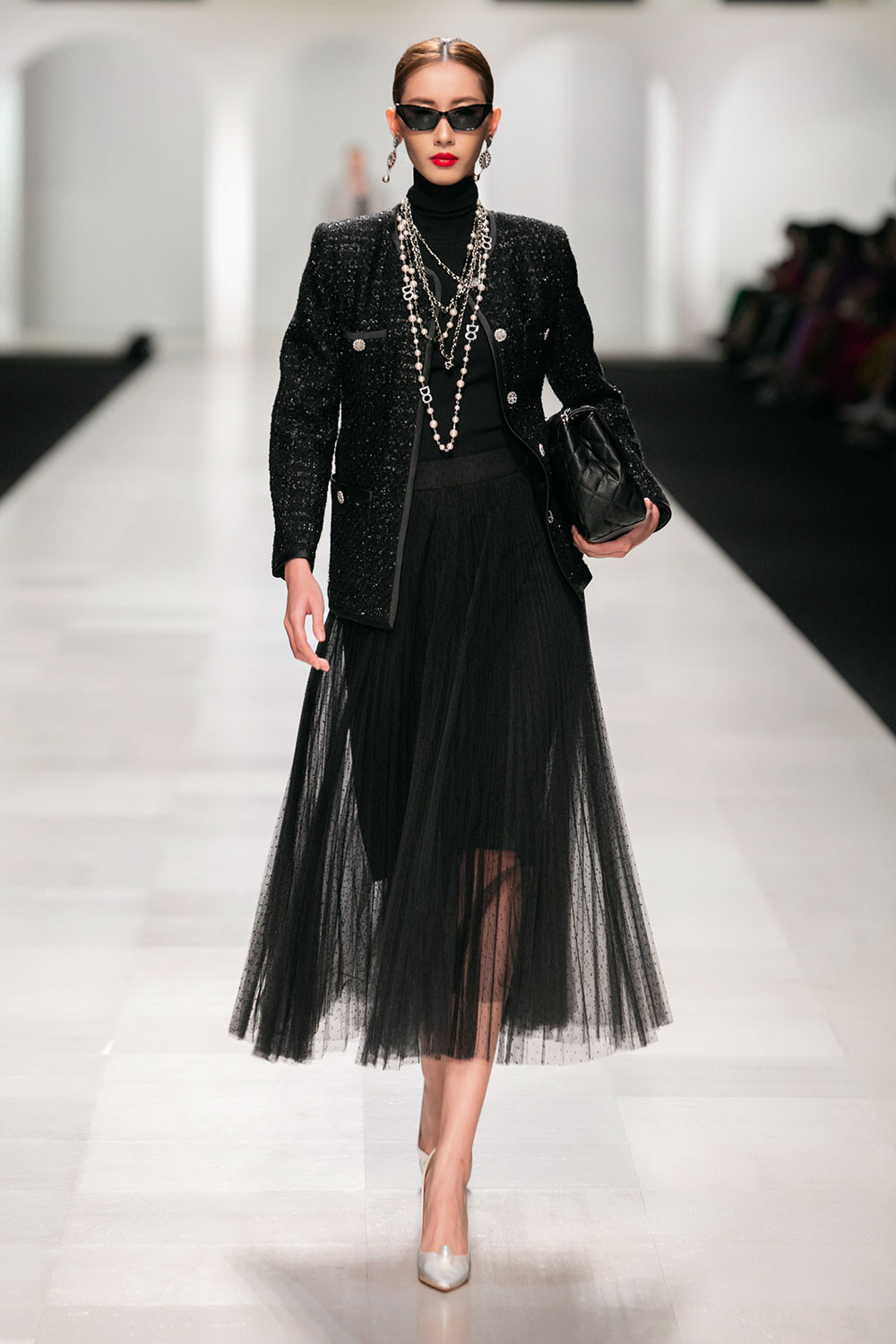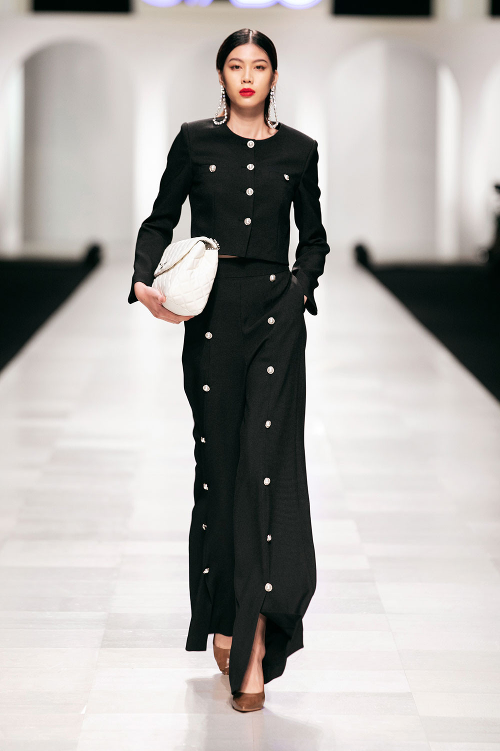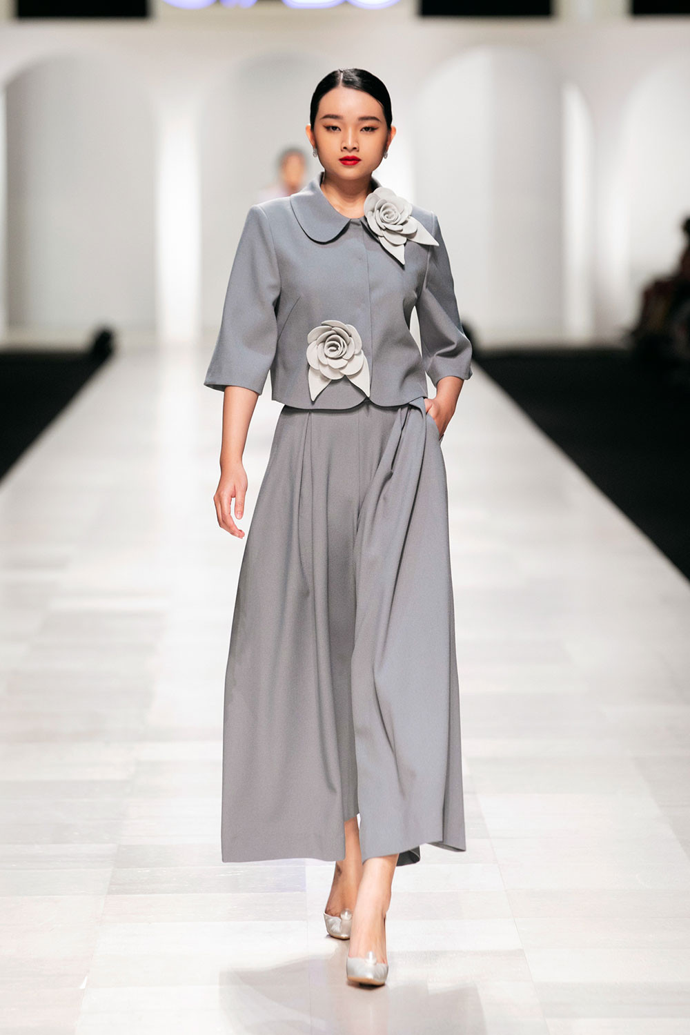 Phần 2 là BST trang phục công sở. NTK sử dụng những tông màu trầm làm chủ đạo như: kem, nâu, đen, ghi với những chi tiết thủ công, hoa 3D được kết hợp để trang phục thêm bắt mắt, không nhàm chán.