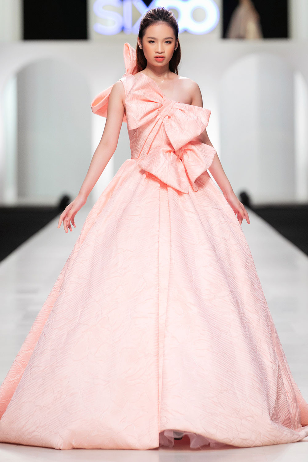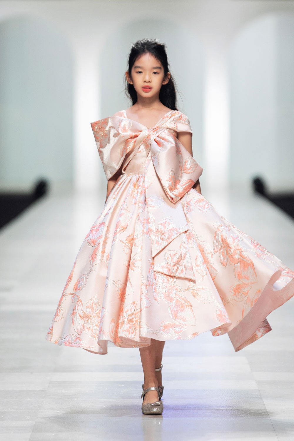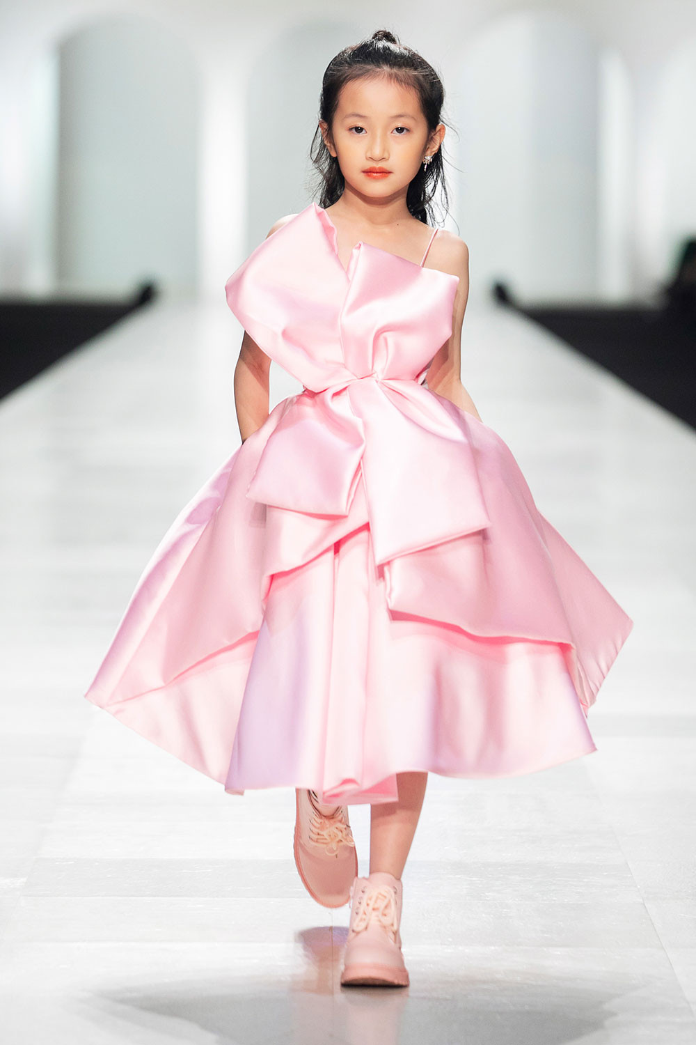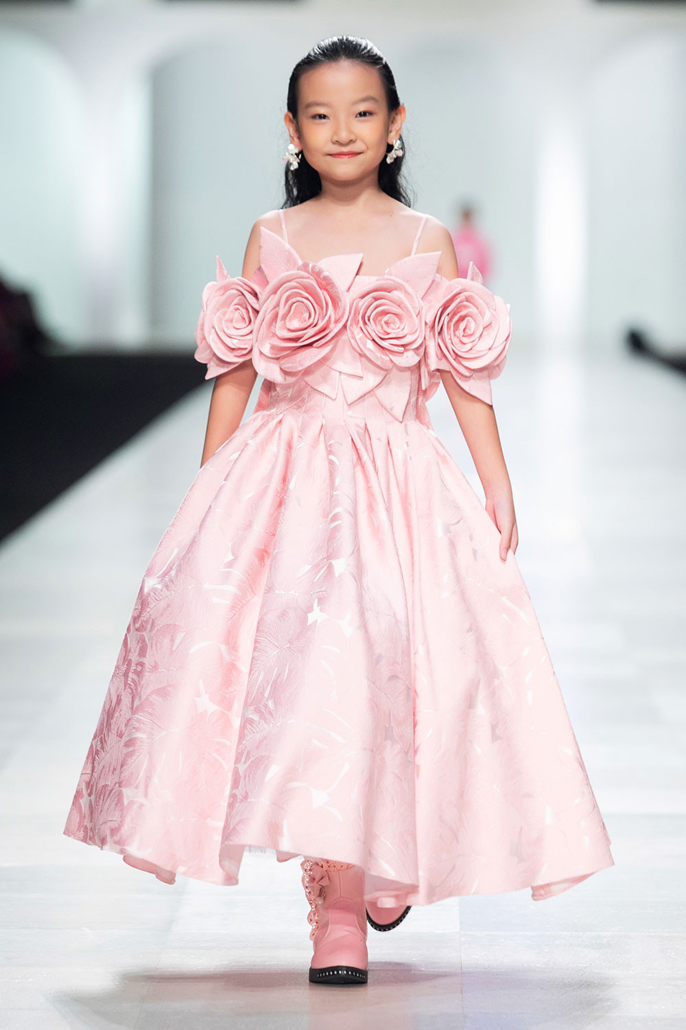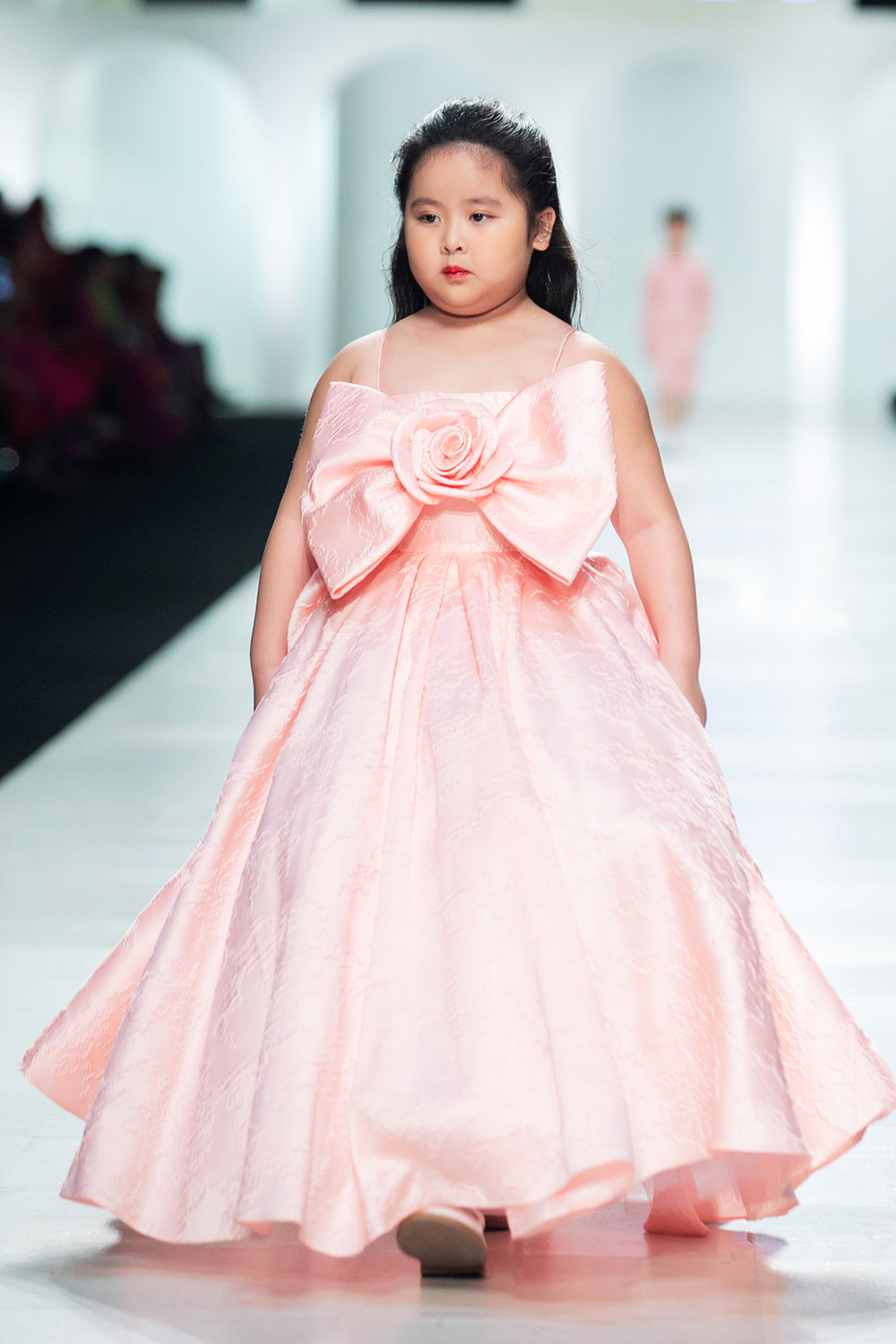 Phần 3 là trang phục dành cho trẻ em, sử dụng màu hồng nhạt làm chủ đạo. Các thiết kế bồng xoè, cầu kỳ, thể hiện sự điệu đà, đáng yêu của các bé gái. Chất liệu chính được sử dụng là vải gấm. Trong khi đó, các bé trai cũng được NTK sáng tạo một số mẫu, mang phong cách năng động.