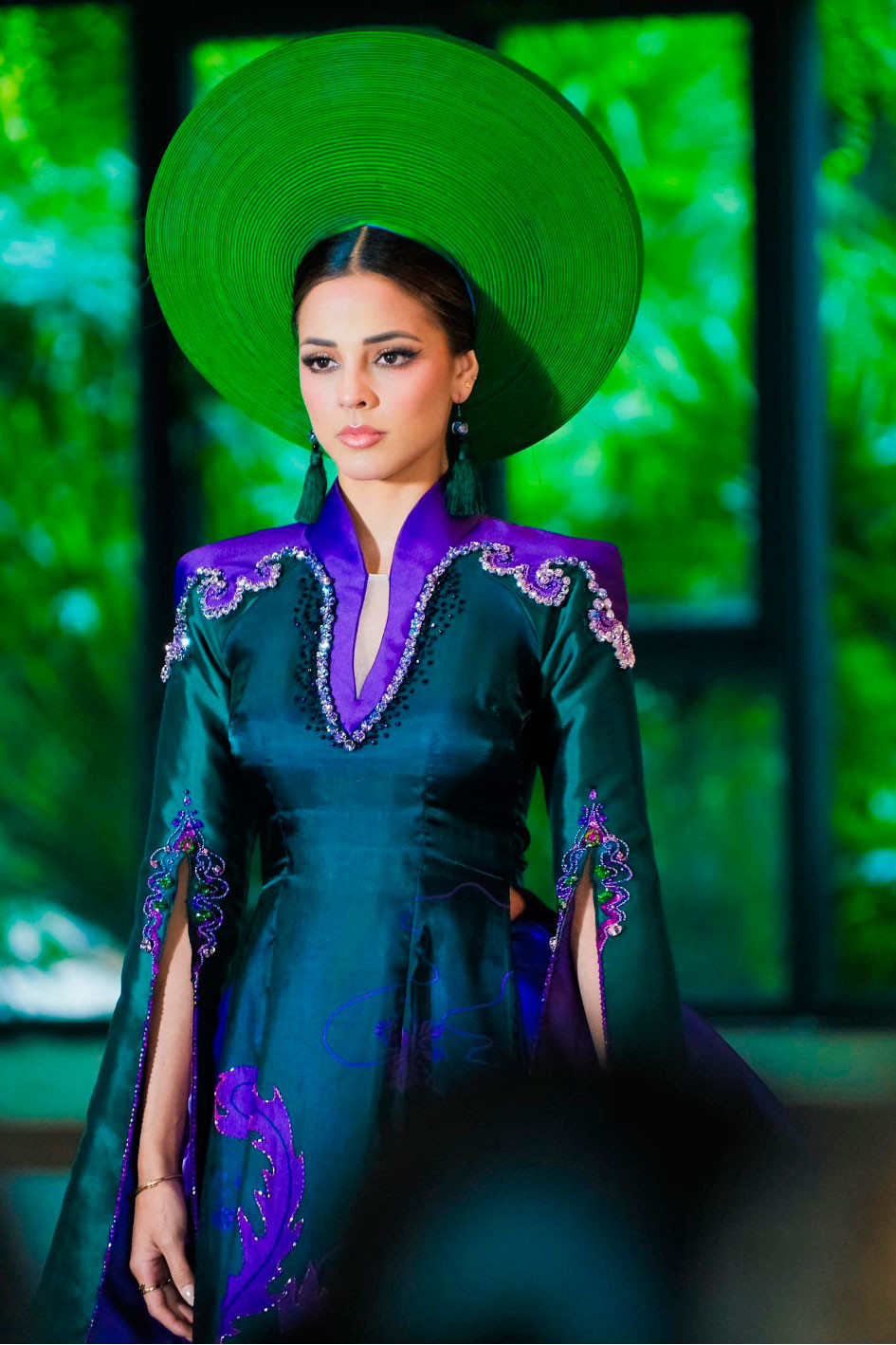 Tone màu tím kết hợp xanh lá trên nền tơ 2 lớp tạo hiệu ứng màu sắc sang trọng cho thiết kế mà tân Hoa hậu Hòa bình trình diễn.