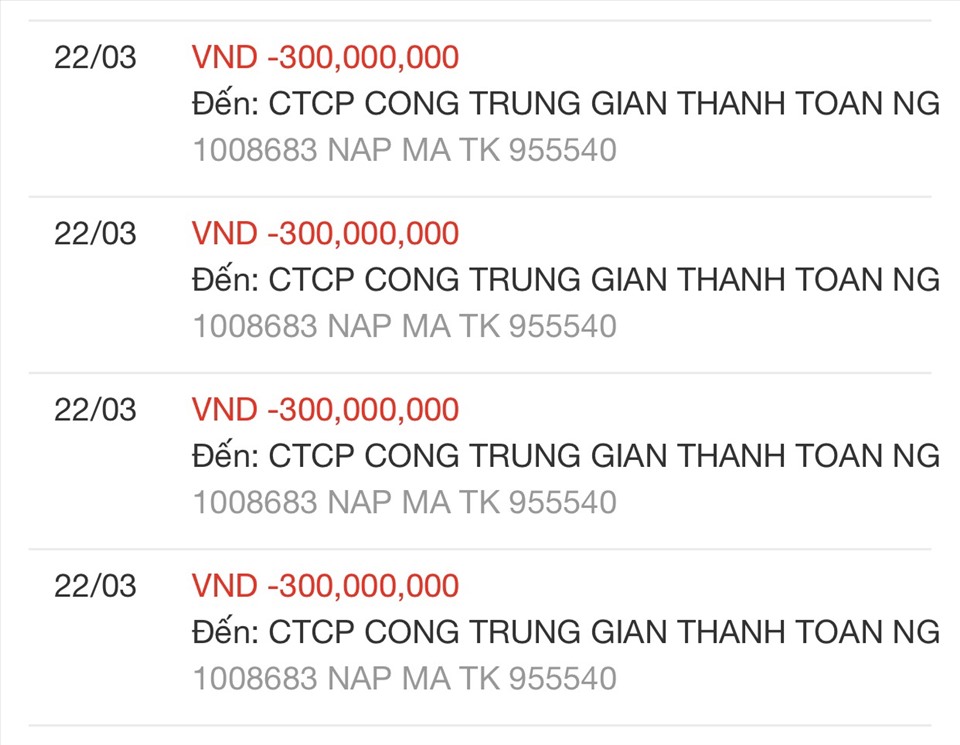 Còn để tham gia sàn DK Trade, chị N.T.M.T (quận Tân Phú, TP.HCM) đã chuyển tới hơn 2 tỉ đồng tới tài khoản của Công ty TNHH Thương mại điện tử Paytrust (trụ sở tại phường Long Bình, TP.Thủ Đức, TP.HCM).