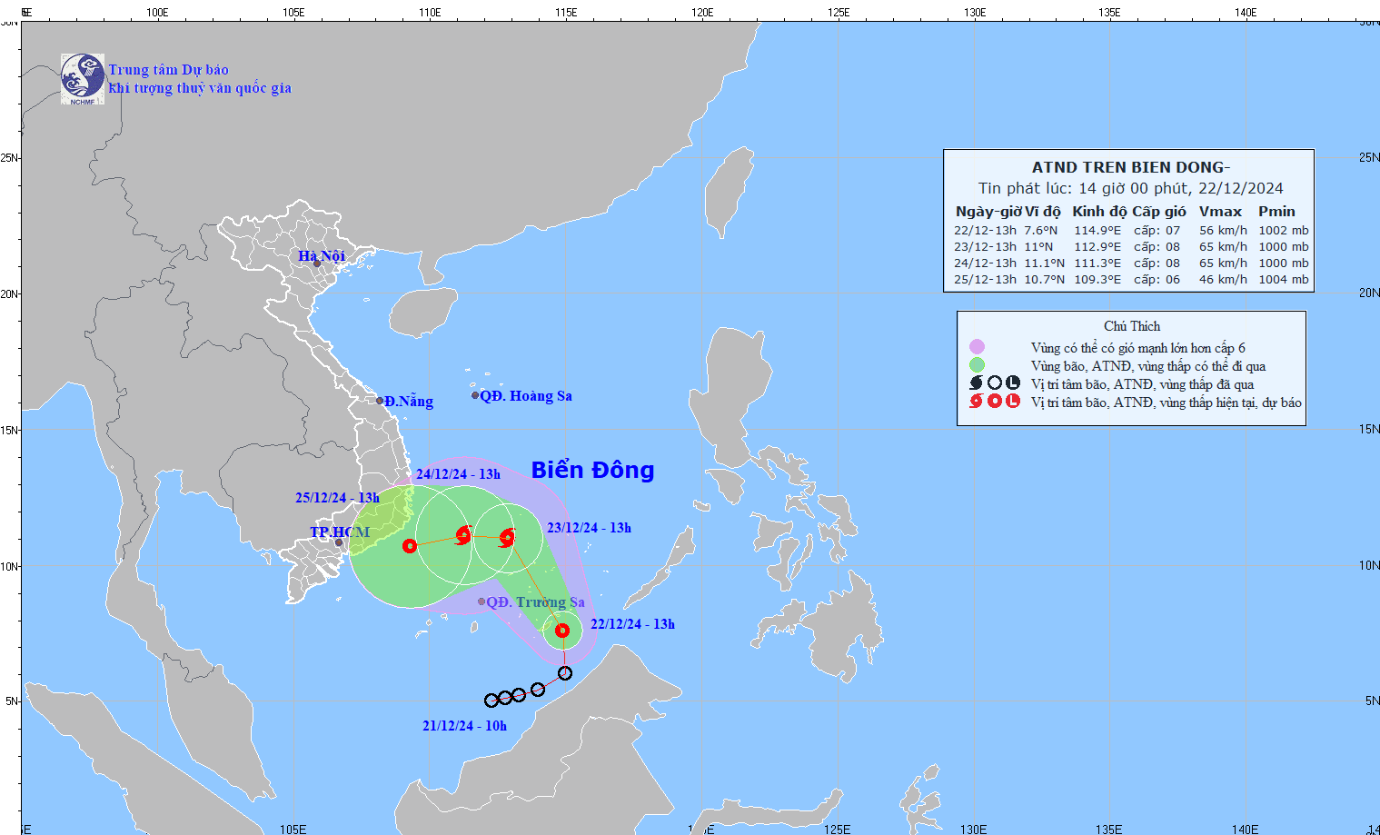 Theo Trung tâm Dự báo Khí tượng Thủy văn Quốc gia, hồi 13h ngày 22/12, vị trí tâm áp thấp nhiệt đới ở vào khoảng 7,6 độ Vĩ Bắc; 114,9 độ Kinh Đông, trên khu vực Nam Biển Đông, cách quần đảo Trường Sa khoảng 350km về phía Đông Đông Nam. Sức gió mạnh nhất vùng gần tâm áp thấp nhiệt đới mạnh cấp 7 (50-61km/h), giật cấp 9.
