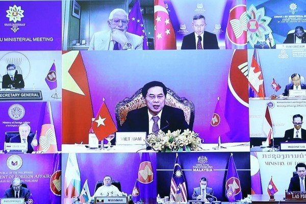 Chiều 6/8, Bộ trưởng Bộ Ngoại giao Bùi Thanh Sơn đã tham dự Hội nghị trực tuyến Bộ trưởng Ngoại giao ASEAN-EU. Đây là hoạt động tiếp theo trong khuôn khổ Hội nghị Bộ trưởng Ngoại giao ASEAN lần thứ 54 (AMM-54) và các Hội nghị liên quan.
