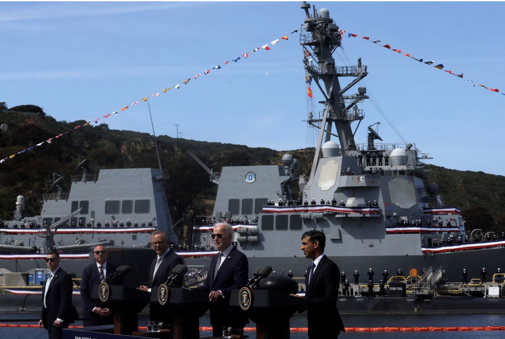 Phát biểu tại buổi lễ diễn ra ở căn cứ hải quân Mỹ tại San Diego với sự hiện diện của Thủ tướng Australia Anthony Albanese và Thủ tướng Anh Rishi Sunak, Tổng thống Mỹ Joe Biden gọi thỏa thuận theo quan hệ đối tác AUKUS 2021 là một phần của cam kết chung hướng tới một khu vực Ấn Độ Dương - Thái Bình Dương tự do và rộng mở với "hai đồng minh mạnh mẽ và có năng lực nhất của Mỹ".
