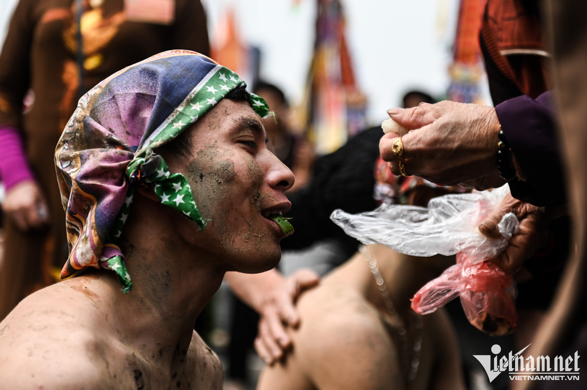 Các "bụt" tiếp tục được đưa xuống ao, lấy bùn trát kín toàn thân và mặt tại bể bùn cách giếng nước gần 200m.