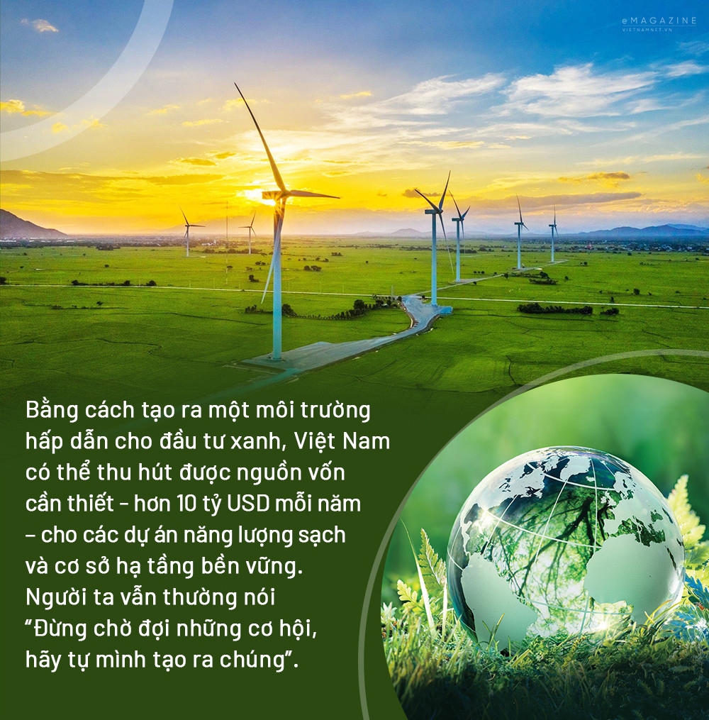Bằng cách tạo ra một môi trường hấp dẫn cho các đầu tư xanh, Việt Nam có thể thu hút được nguồn vốn cần thiết - hơn 10 tỷ USD mỗi năm – cho các dự án năng lượng sạch và cơ sở hạ tầng bền vững. Người ta vẫn thường nói “Đừng chờ đợi những cơ hội, hãy tự mình tạo ra chúng”.