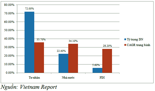 Trong Bảng xếp hạng Top 500 DN tăng trưởng nhanh nhất Việt Nam do Vietnam Report công bố mới đây cũng cho thấy, doanh nghiệp Tư nhân vẫn là khối có số lượng doanh nghiệp tăng trưởng nhanh chiếm tỷ trọng lớn hơn nhiều so với hai khối Nhà nước và FDI (72%). Tỷ lệ tăng trưởng hàng năm kép bình quân (CAGR) của khối này cũng ở mức cao nhất là 35.7%.