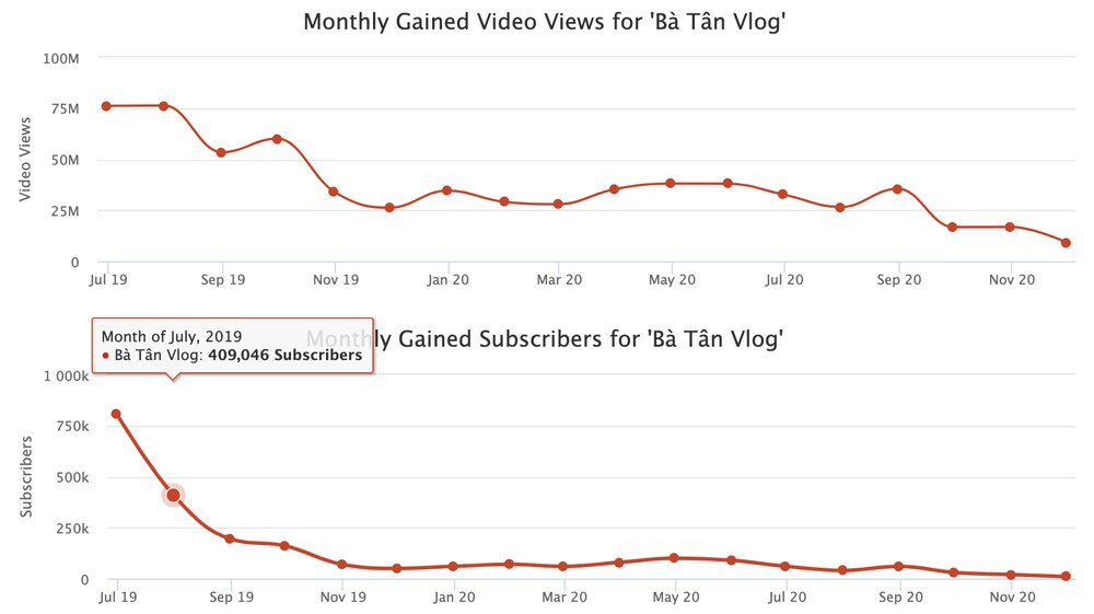 Nếu như thời kỳ mới nổi, tức là khoảng từ giữa năm ngoái, kênh của bà Tân Vlog 'bỏ túi' khoảng 75 triệu lượt xem mỗi tháng, thì tới nay, con số ấy thậm chí còn chẳng bằng một nửa. Trong 30 ngày gần đây nhất, kênh YouTube của Bà Tân chỉ "đút túi" khoảng 10 triệu lượt xem, theo ghi nhận của Social Blade.