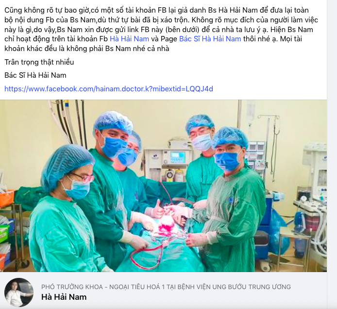 Tháng 11, thạc sĩ, bác sĩ Hà Hải Nam, Phó Trưởng khoa Ngoại tiêu hóa, Bệnh viện K (Hà Nội), bất ngờ phát hiện một Facebook lấy tên và hình ảnh của mình, giới thiệu là Phó Trưởng khoa - Ngoại tiêu hóa 1 tại Bệnh viện Ung bướu Trung ương dù ở Việt Nam, không có bệnh viện nào tên như vậy.