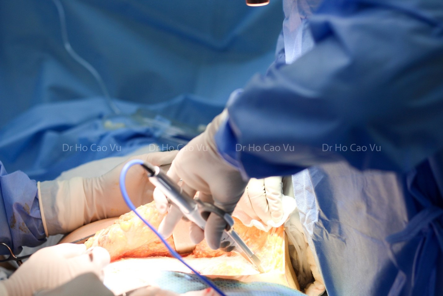 Ths. BS. Hồ Cao Vũ lưu ý, “Trong phẫu thuật tạo hình thành bụng sau sinh có một lớp rất quan trọng là “lớp mạc” trước cân cơ, trong lớp mạc có mạch bạch huyết rất nhiều nên khi tách lớp mỡ ra khỏi lớp cân cơ thành bụng bác sĩ phải chừa lại lớp cân cơ đó và đi vào lớp mạc trước cân cơ để bảo tồn mạch bạch huyết. Sau khi hút mỡ bằng máy hút và dụng cụ bác sĩ sẽ rạch da bên ngoài bằng dao thường. Sau đó bóc tách lớp mỡ ra khỏi lớp cân cơ bằng dao Harmonic. Dao đốt thường không có khả năng hàn mạch bạch huyết cũng như cầm máu không tốt bằng dao Harmonic, đồng thời có khả năng gây bỏng mô nên gây tiết dịch và đau sau phẫu thuật nhiều hơn”.