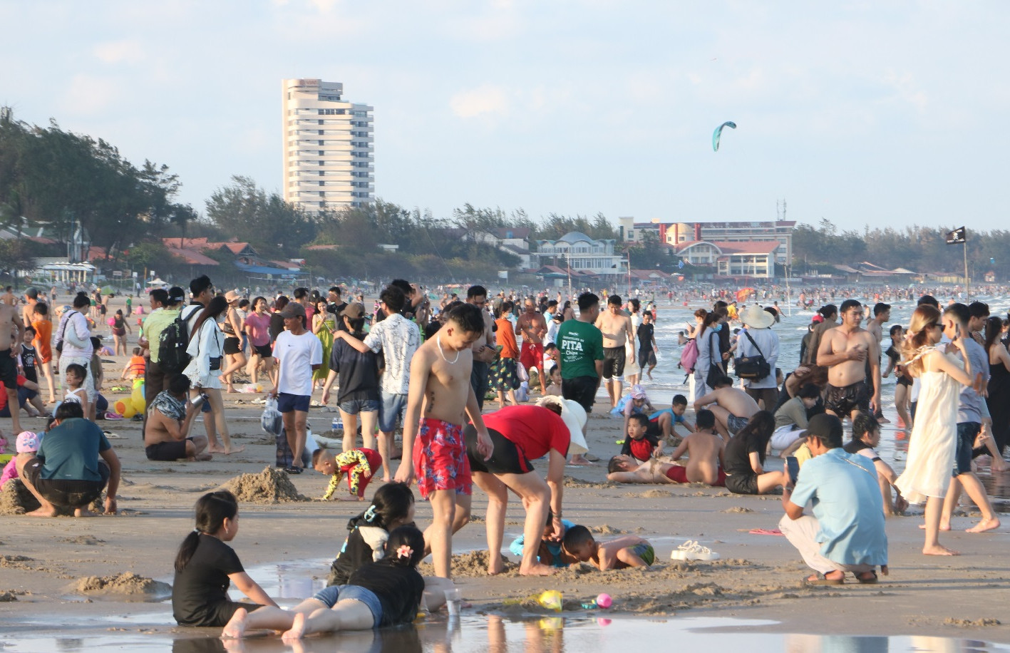 Dưới bãi Sau, trong tiết trời nóng bức, du khách đổ xô xuống tắm biển từ khá sớm để giải nhiệt.