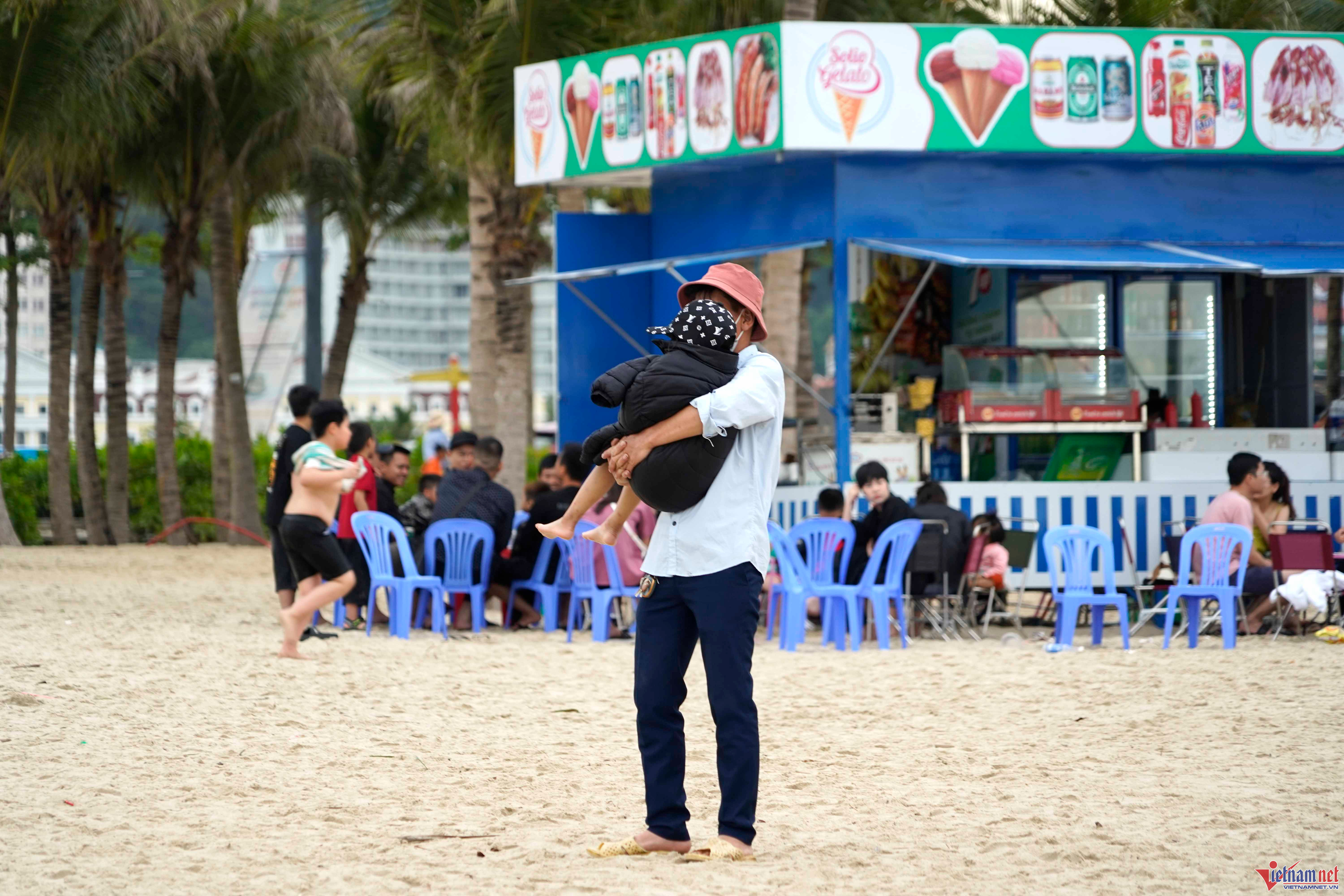 Chiều nay, bãi biển Bãi Cháy chỉ lác đác vài người đi dạo trên bãi cát. Dưới biển, một số du khách xuống tắm nhưng đứng co ro vì rét, khu vực ghế ngồi ế khách, chỗ tắm tráng không còn cảnh xếp hàng chờ tới lượt.