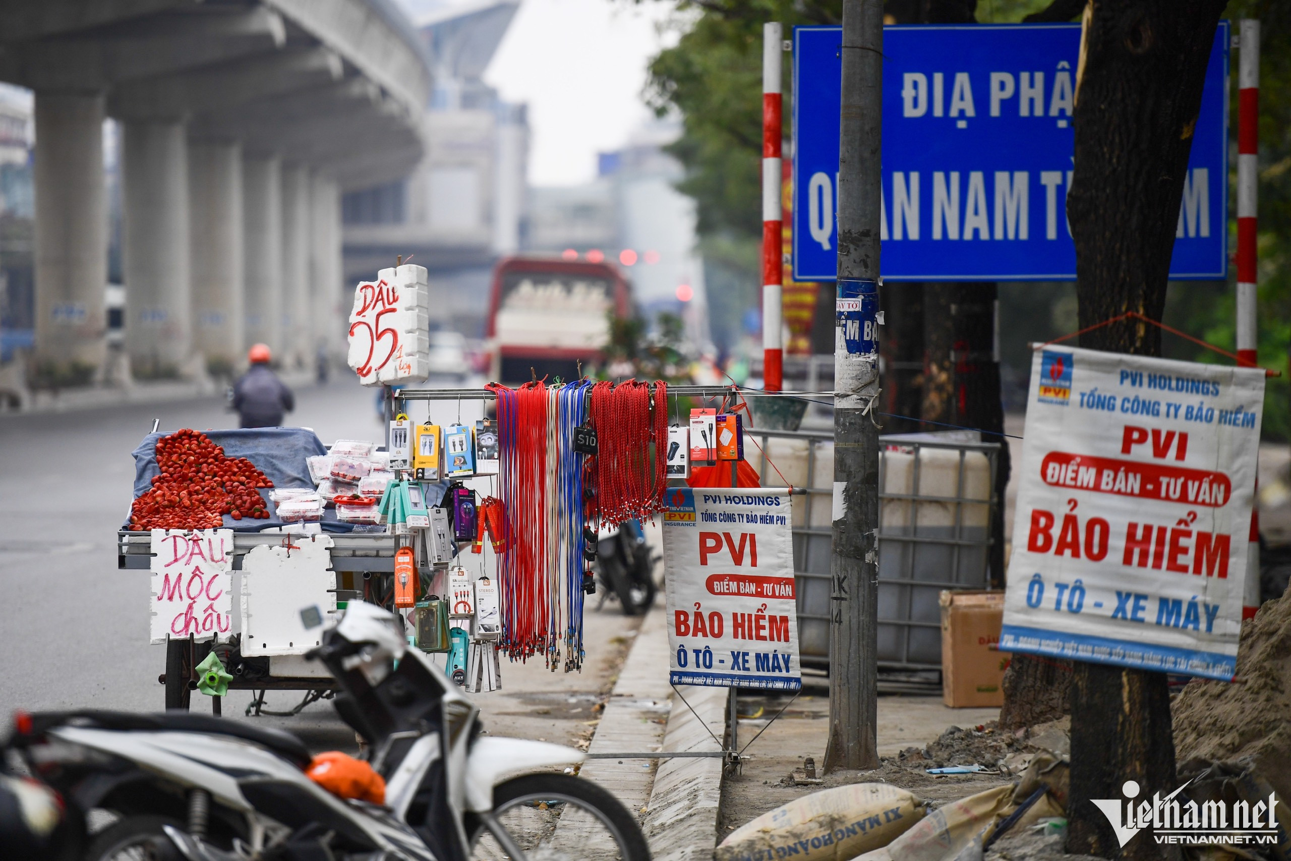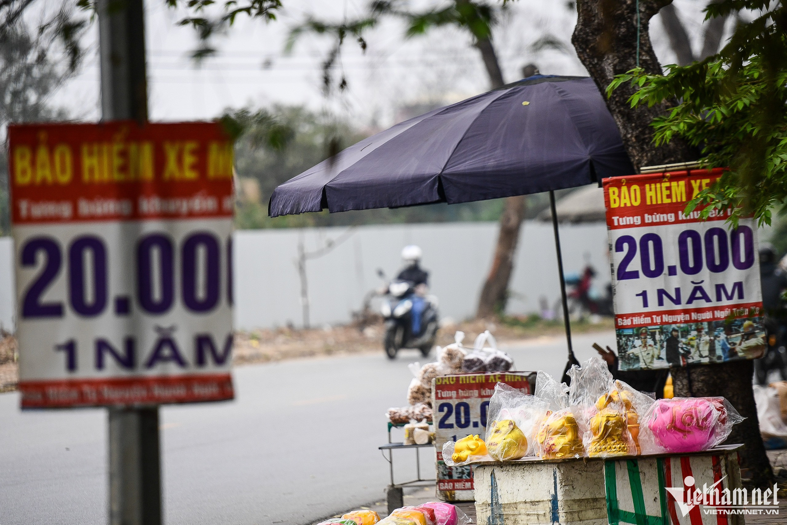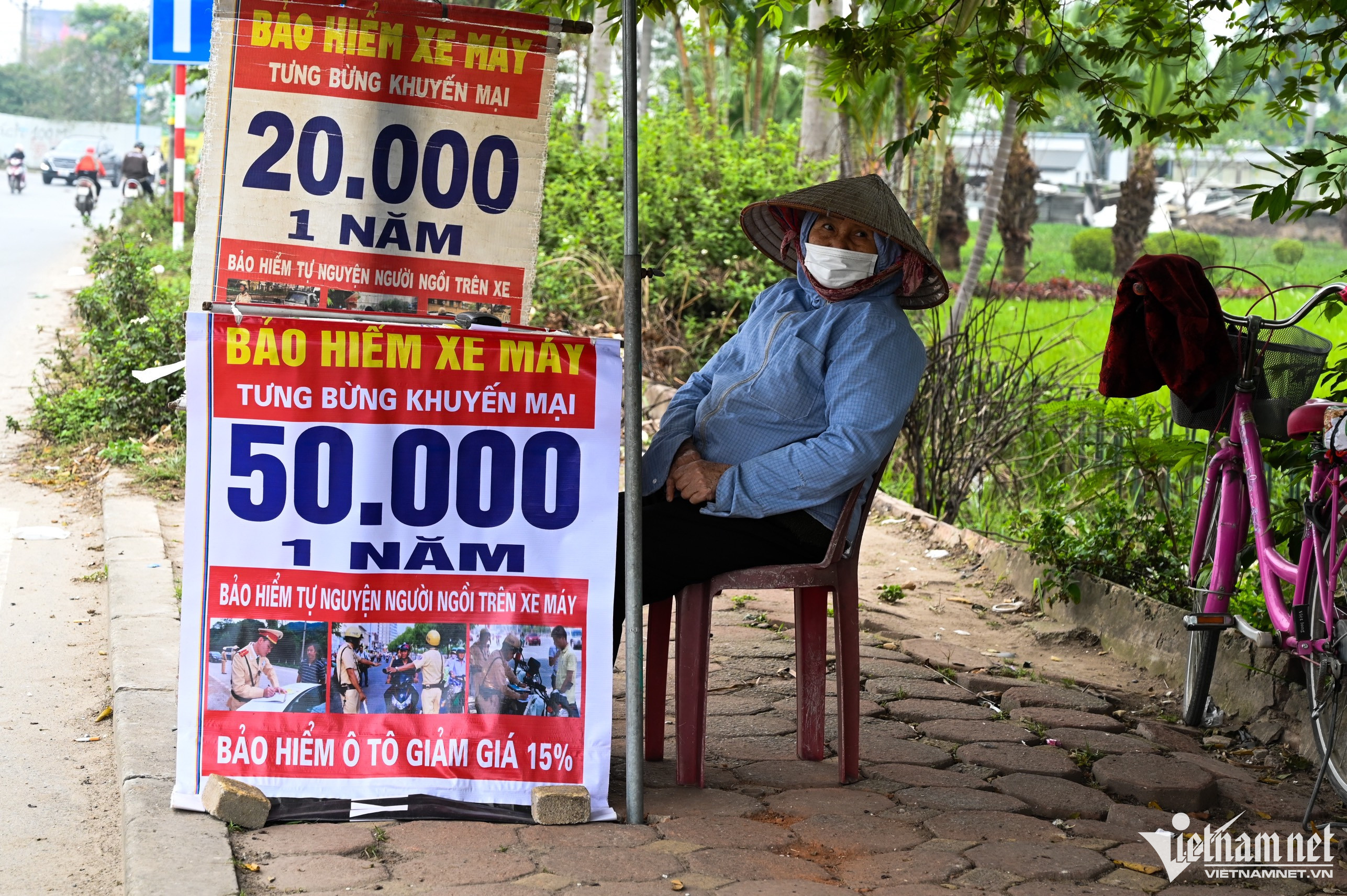 Người bán thường chọn các khu vực vắng vẻ, không có nhà dân sinh sống. Tại đây, họ có thể vừa kinh doanh trà đá hoặc những mặt hàng khác vừa quảng cáo bảo hiểm xe máy. Hình ảnh gần chân cầu Thăng Long, bên đường Hoàng Sa (huyện Đông Anh).