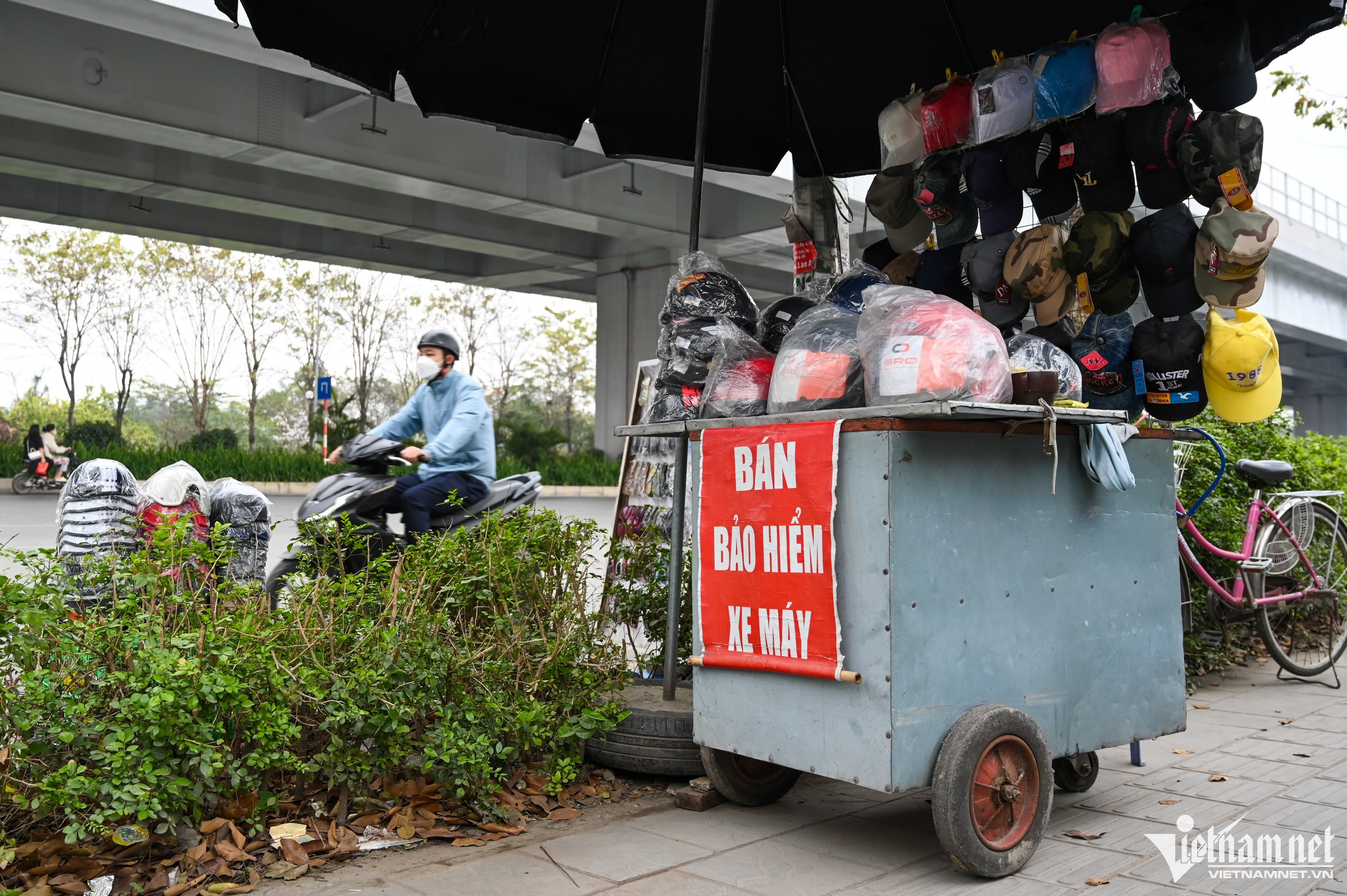 Một điểm kinh doanh mũ bán cả bảo hiểm xe máy bên lề đường Phạm Văn Đồng (quận Bắc Từ Liêm).