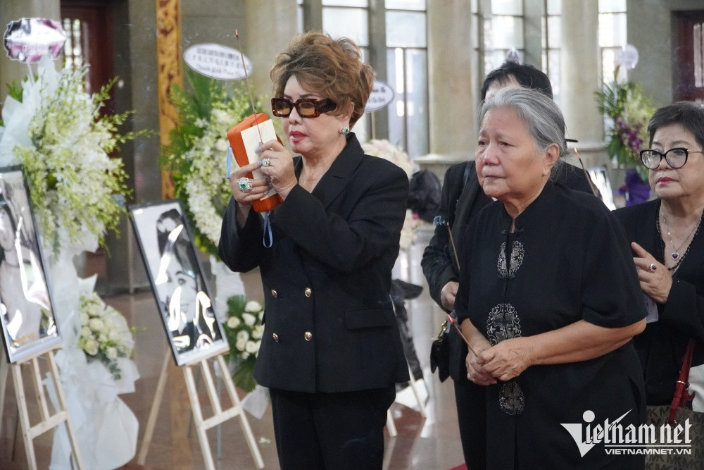 Tang lễ minh tinh Thẩm Thúy Hằng diễn ra tại Nhà tang lễ Quốc gia phía Nam, quận Gò Vấp, TP.HCM. 4 con trai của bà gồm Nguyễn Thanh Vũ, Nguyễn Xuân Dũng và cặp song sinh Nguyễn Xuân Ái Quốc - Nguyễn Xuân Quốc Việt túc trực đón quan khách đến tiễn đưa mẹ. Những hình ảnh ghi lại nhan sắc lộng lẫy thời trẻ của Thẩm Thúy Hằng được gia đình đặt 2 bên lối đi. Ngoài giới nghệ sĩ, một số khán giả, các đơn vị như Hội liên hiệp Phụ nữ, Ủy ban Mặt trận Tổ quốc Việt Nam TP.HCM... cũng gửi lẵng hoa đến viếng. Theo nguyện vọng của Thẩm Thúy Hằng lúc sinh thời, tiền phúng điếu trong lễ tang được gia đình dùng cho công tác từ thiện. Chiều 10/9, NSƯT Trịnh Kim Chi đến thắp hương trước linh cữu cố nghệ sĩ. Chị là thành viên trong ban tang lễ, tất bật cùng gia đình lo chu toàn hậu sự.