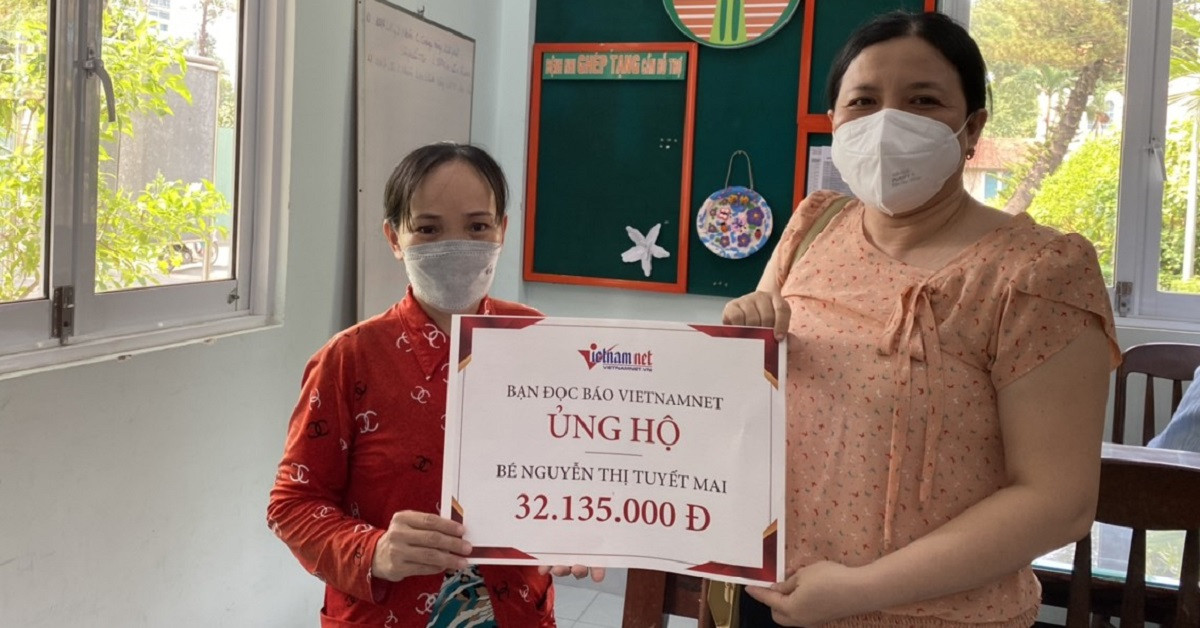 May nhờ bạn đọc VietNamNet lan tỏa câu chuyện ngặt nghèo của gia đình, nhiều trái tim ấm đã san sẻ giúp chị. Trước đó, để kịp thời hỗ trợ mẹ con chị, Báo VietNamNet đã trao đợt 1 số tiền 32.135.000 đồng. Mới đây, đại diện báo đã có mặt tại phòng công tác xã hội Bệnh viện Nhi đồng 2, tiếp tục trao 33.223.333 do bạn đọc ủng hộ cho bé Tuyết Mai. Tổng số tiền gia đình đã nhận được là 65.358.333 đồng.