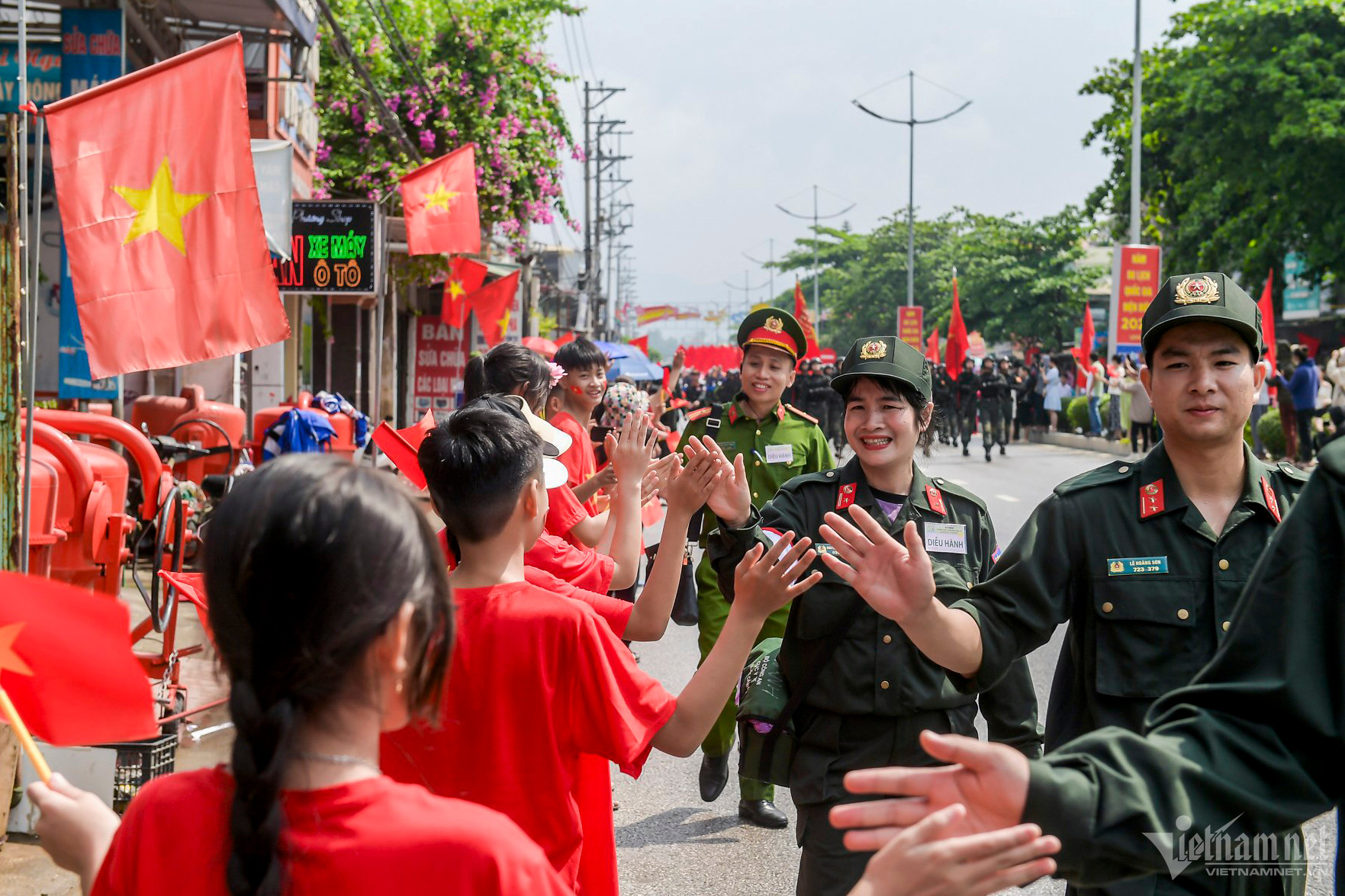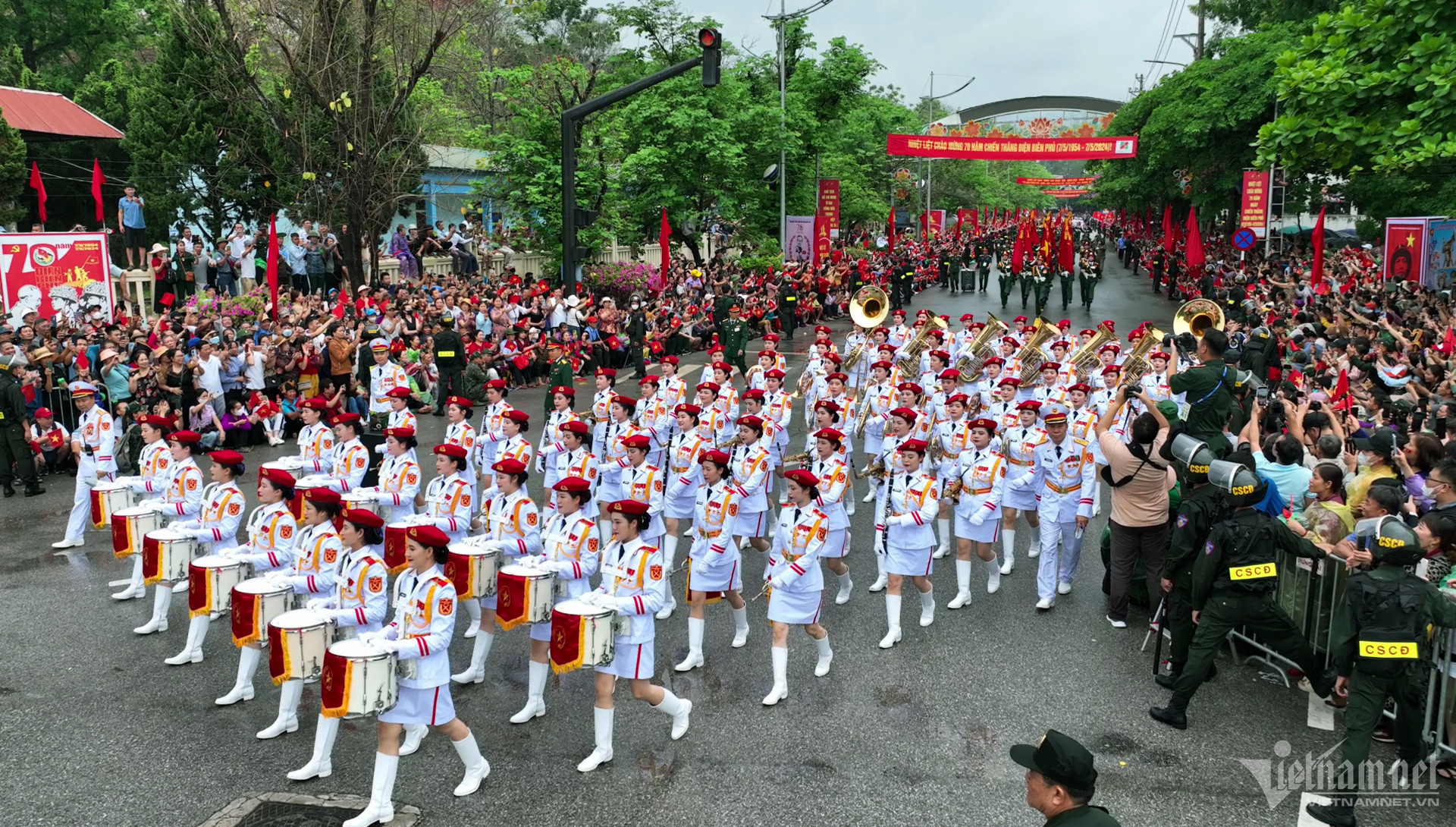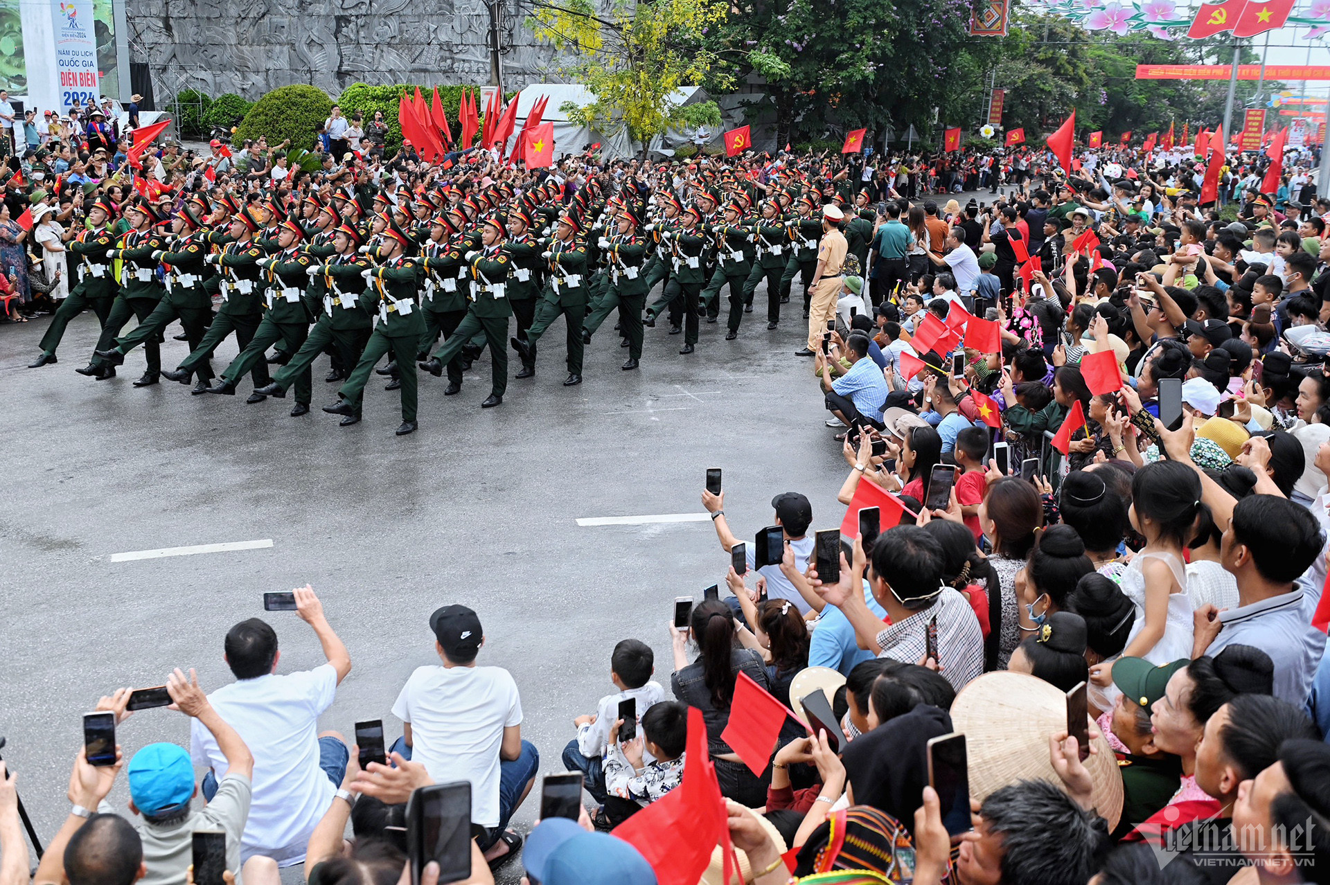 Trong lễ diễu binh, diễu hành, từng đoàn quân đi đều bước giữa tiếng quân nhạc hùng tráng vang lên ở sân vận động và các tuyến phố Điện Biên Phủ khiến hàng chục nghìn người cảm thấy xúc động và tự hào.