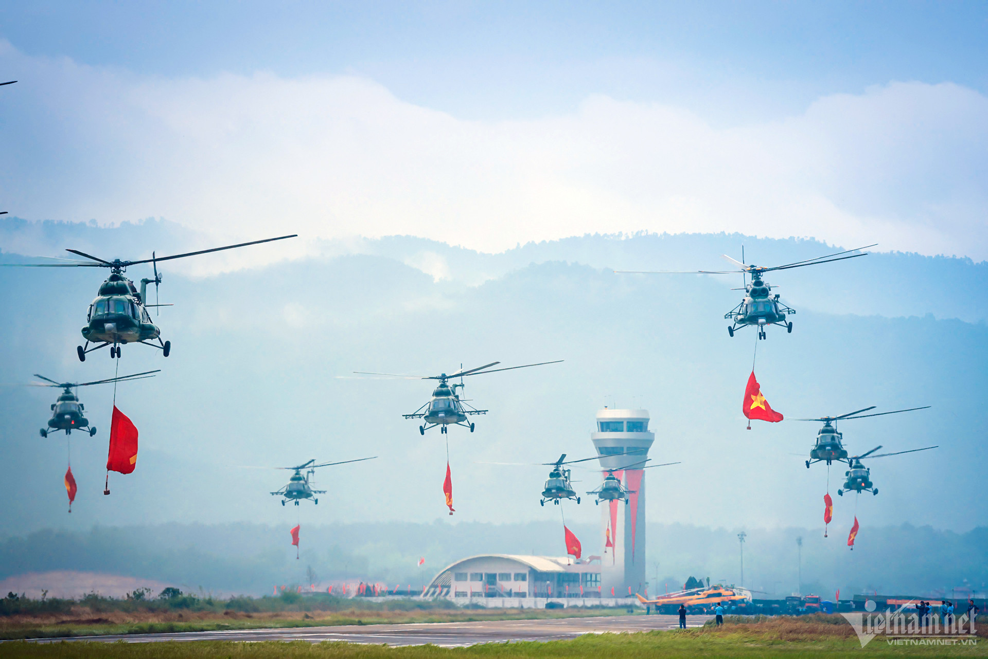 Dàn trực thăng cất cánh từ sân bay Điện Biên, bay ngang qua sân vận động tỉnh, mang theo cờ Đảng, cờ Tổ quốc tạo nên sự hùng tráng của Lễ kỷ niệm 70 năm Chiến thắng Điện Biên Phủ, sáng 7/5.