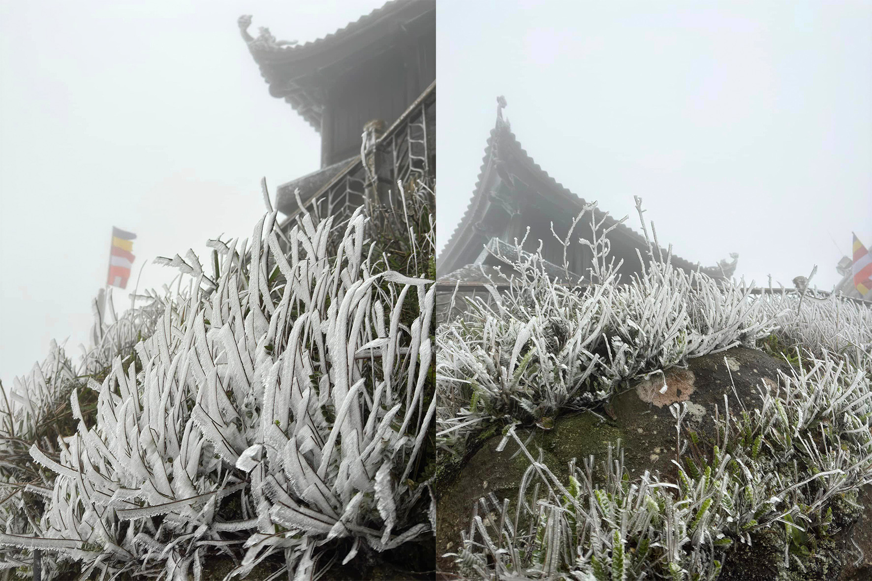 Tại đây, mái chùa, chuông và khánh cùng lan can trước chùa Đồng đều phủ lớp băng trắng. Ngoài ra, cây cối khu vực phía dưới cũng bị đóng băng. Lớp băng dày xuôi theo một hướng do gió kèm nước mưa thổi mạnh.