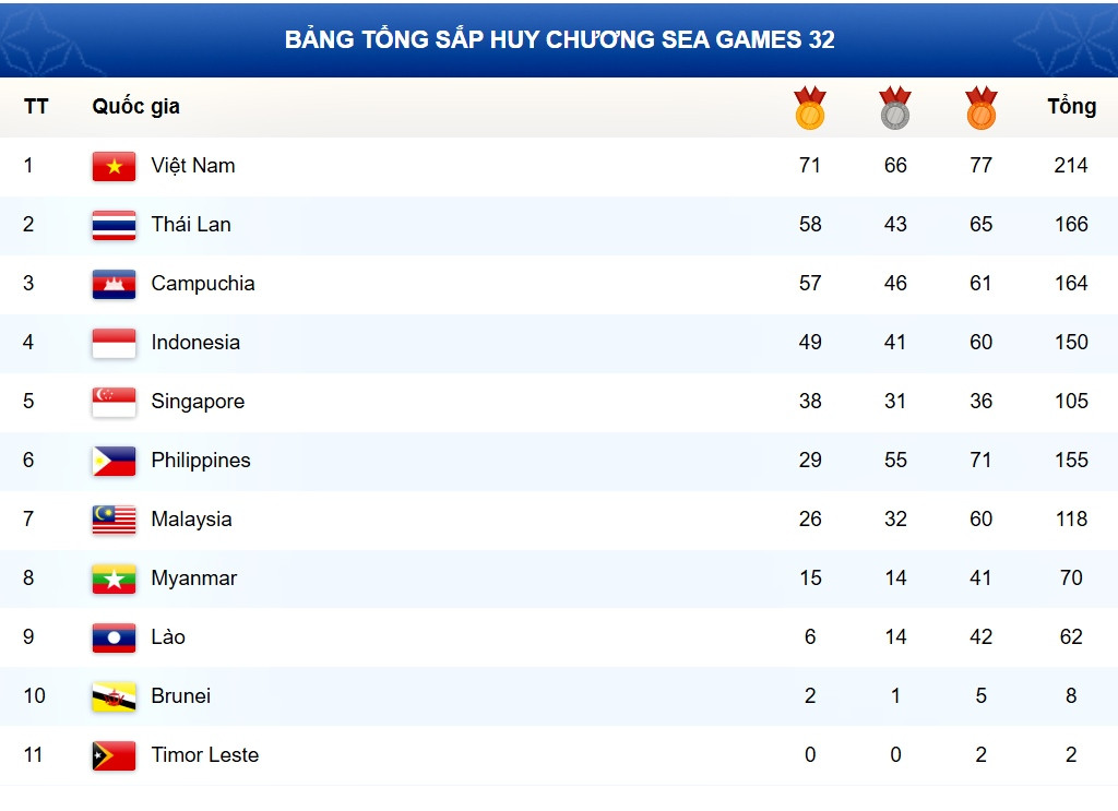 BẢNG TỔNG SẮP HUY CHƯƠNG SEA GAMES 32