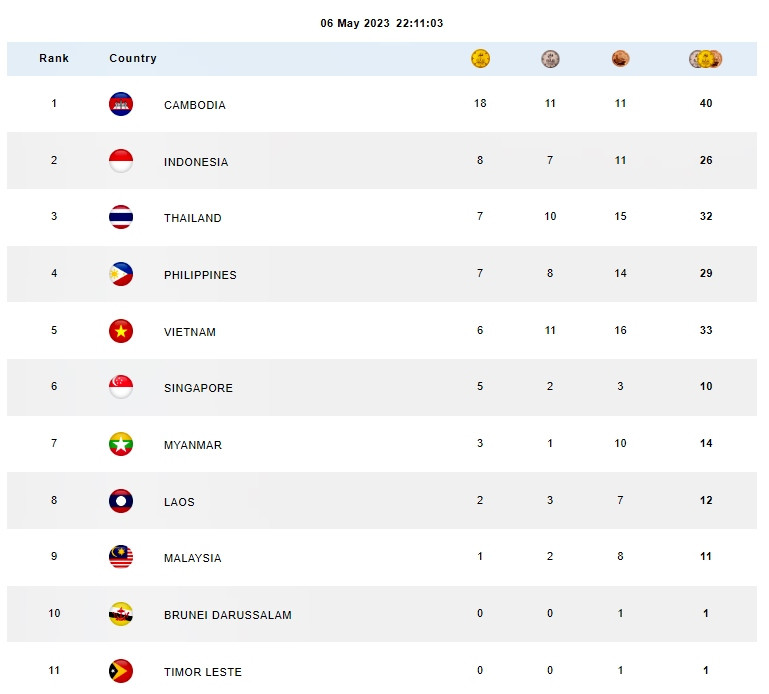 Bảng tổng sắp huy chương SEA Games 32 hôm nay 6/5VietNamNet cập nhật liên tục Bảng tổng sắp huy chương tại SEA Games 32 hôm nay 6/5 nhanh, đầy đủ và chính xác nhất.