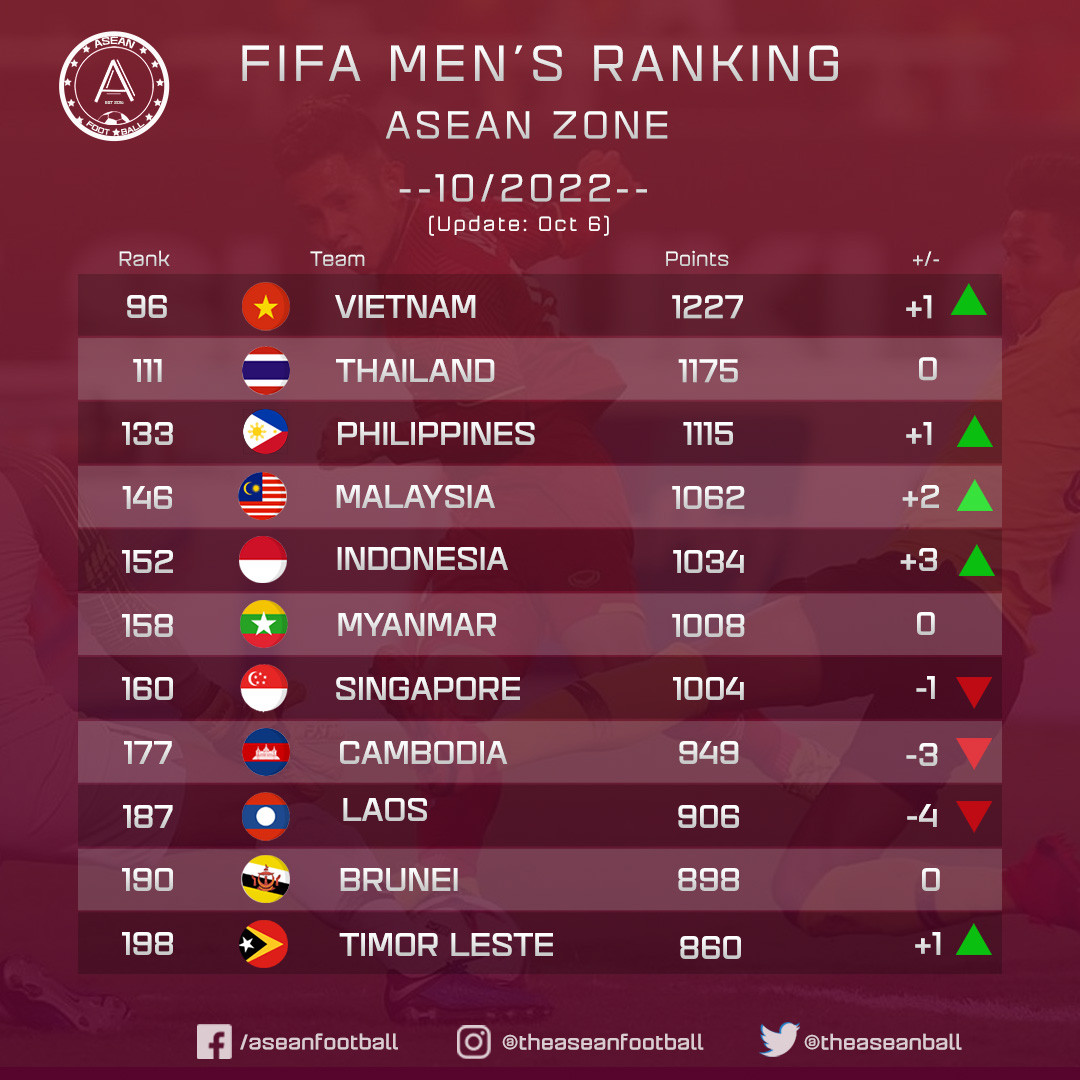 "Những chiến binh sao vàng" vẫn đứng đầu khu vực Đông Nam Á, trong khi Indonesia có sự tiến bộ vượt bậc. 2 chiến thắng trước Curacao có thứ hạng cao hơn giúp thầy trò HLV Shin Tae-yong nhận 14,71 điểm, tăng từ 155 lên vị trí thứ 152. Malaysia cũng tăng 1 bậc, từ 148 lên 147, nhờ kết quả tích cực tại King’s Cup 2022.