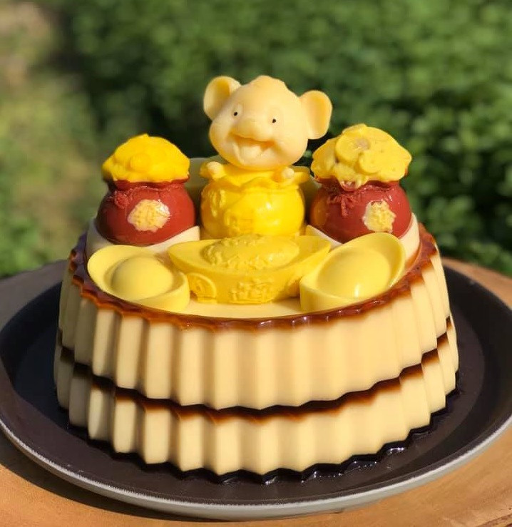 Bên cạnh bánh dứa hình thỏi vàng, những chiếc bánh kem hình Thần Tài với đủ kích cỡ khác nhau cũng được cửa hàng này tung ra thị trường trong ngày vía Thần Tài. Theo lời nhân viên cửa hàng, giá bán một chiếc bánh size 16 là 499.000 đồng/chiếc.