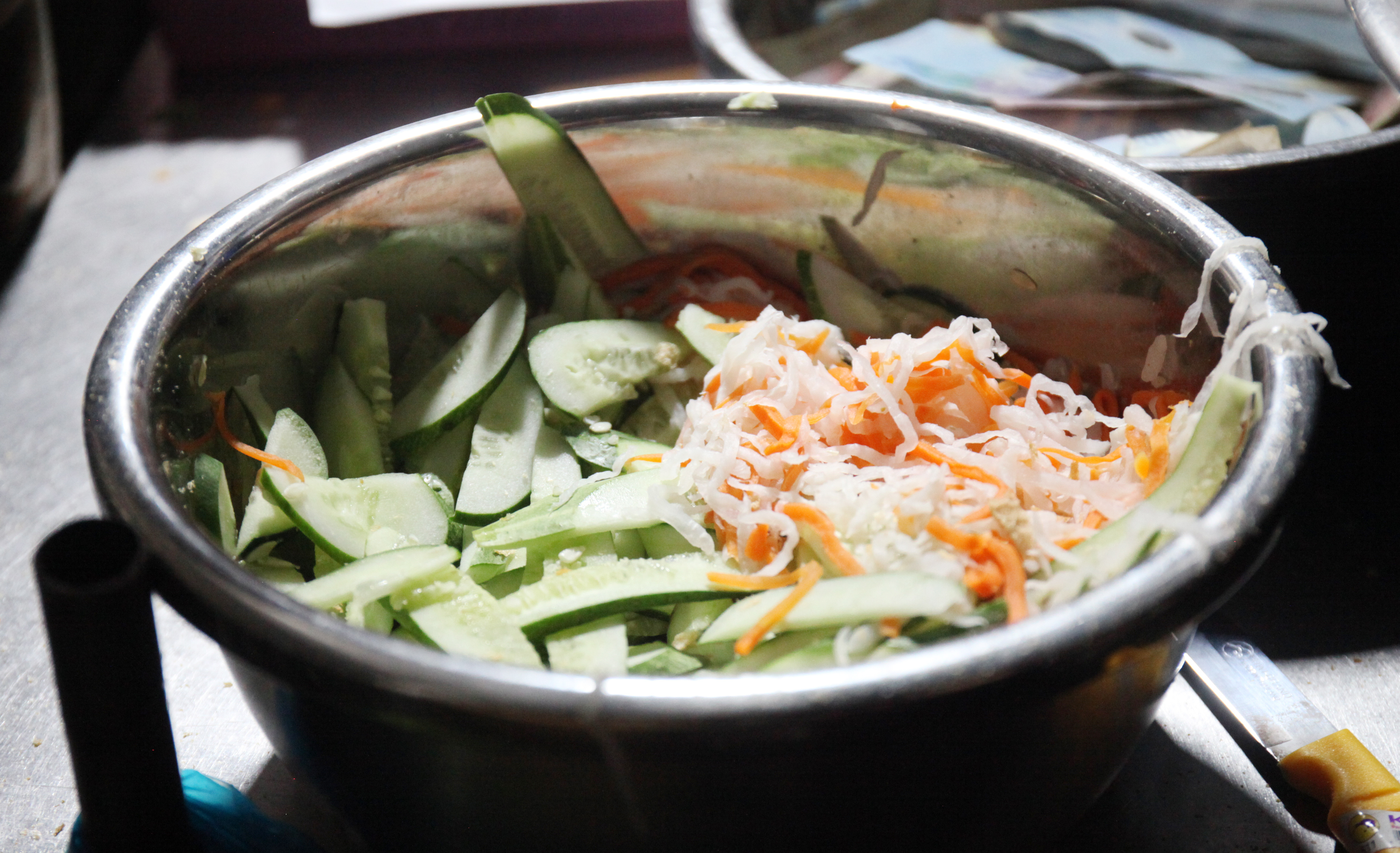 Ban đầu bà đứng bán một mình, về sau mỗi lúc một đông nên bà thuê thêm 4 người phụ nữ hàng xóm phụ bán. Mỗi người một việc, từ nướng thịt, xẻ bánh, thêm topping, gói bánh và thu tiền.