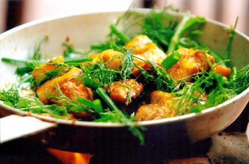Thực khách tự tay cho thêm hành lá, rau thì là và các loại rau thơm khác vào chảo và đảo đều tay, tạo ra hương thơm ngào ngạt khiến ai nấy đều không thể cưỡng lại.