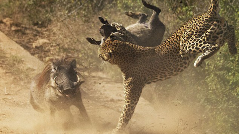 Khoảnh khắc lợn rừng mẹ liều mạng lao vào tấn công báo đốm để cứu con thoát chết được nhiếp ảnh gia Koos Fourie ghi lại tại Công viên quốc gia Kruger, Nam Phi.