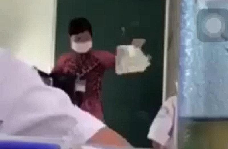 Thầy giáo tát học sinh, cô giáo thả sách vở xuống đất ngay trên bục giảng