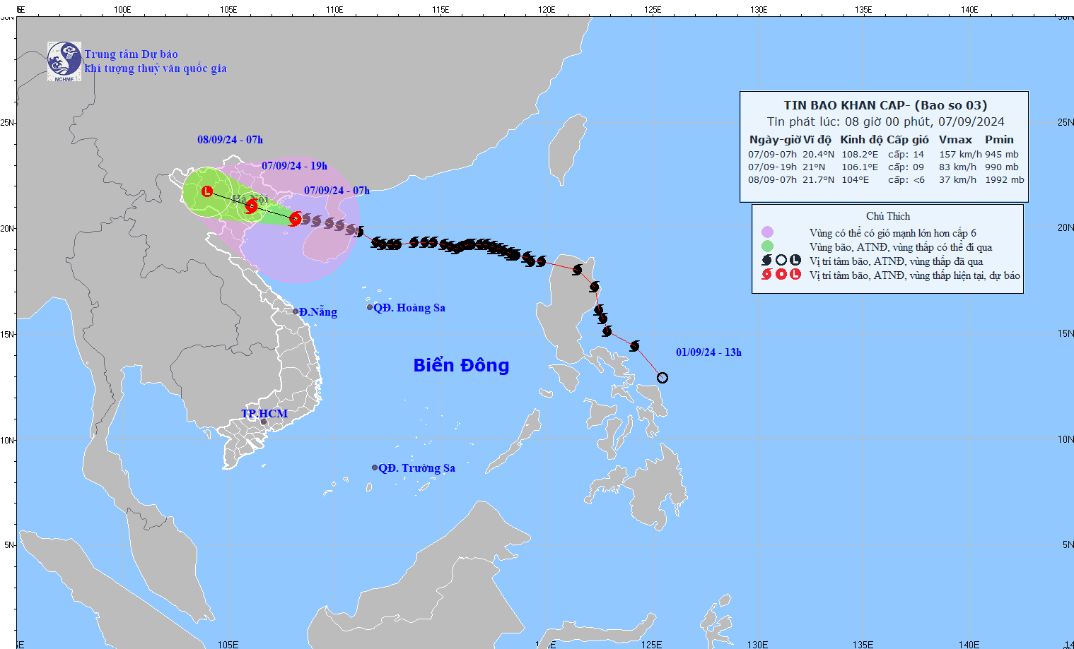 Đến 7h sáng nay (7/9), vị trí tâm bão số 3 Yagi trên vùng biển Vịnh Bắc Bộ; cách Quảng Ninh - Thái Bình khoảng 150km về phía Đông Đông Nam. Sức gió mạnh nhất vùng gần tâm bão mạnh cấp 14 (150-166km/h), giật cấp 17, di chuyển theo hướng Tây Tây Bắc, tốc độ 15-20km/h. Đến 8h sáng, bão cách bờ biển Quảng Ninh - Hải Phòng khoảng 132km.