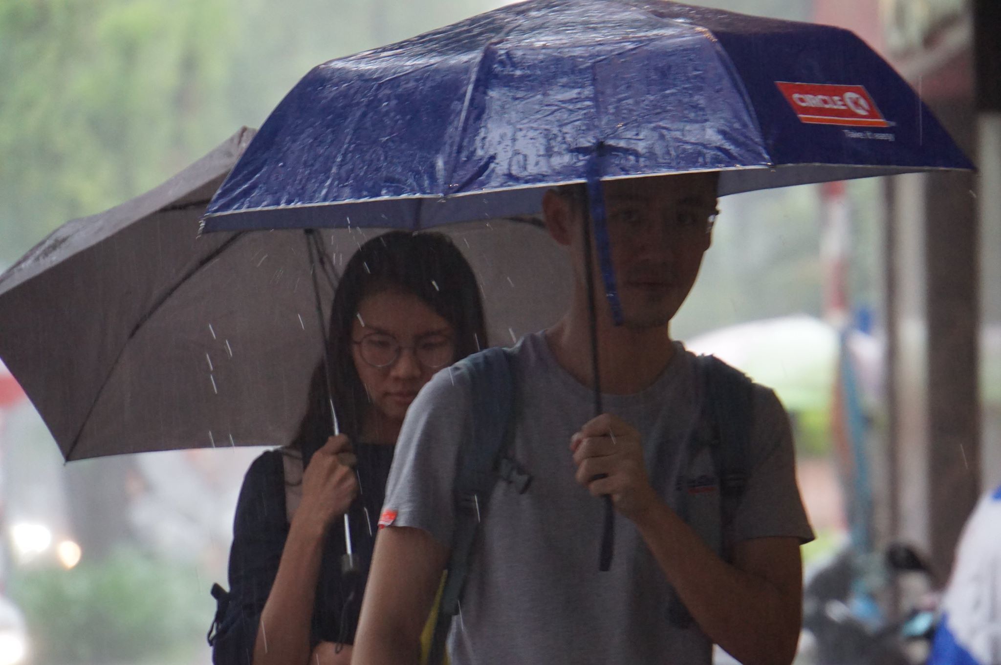 | Du khách che ô đi mưa trên đường phố Sài Gòn |
