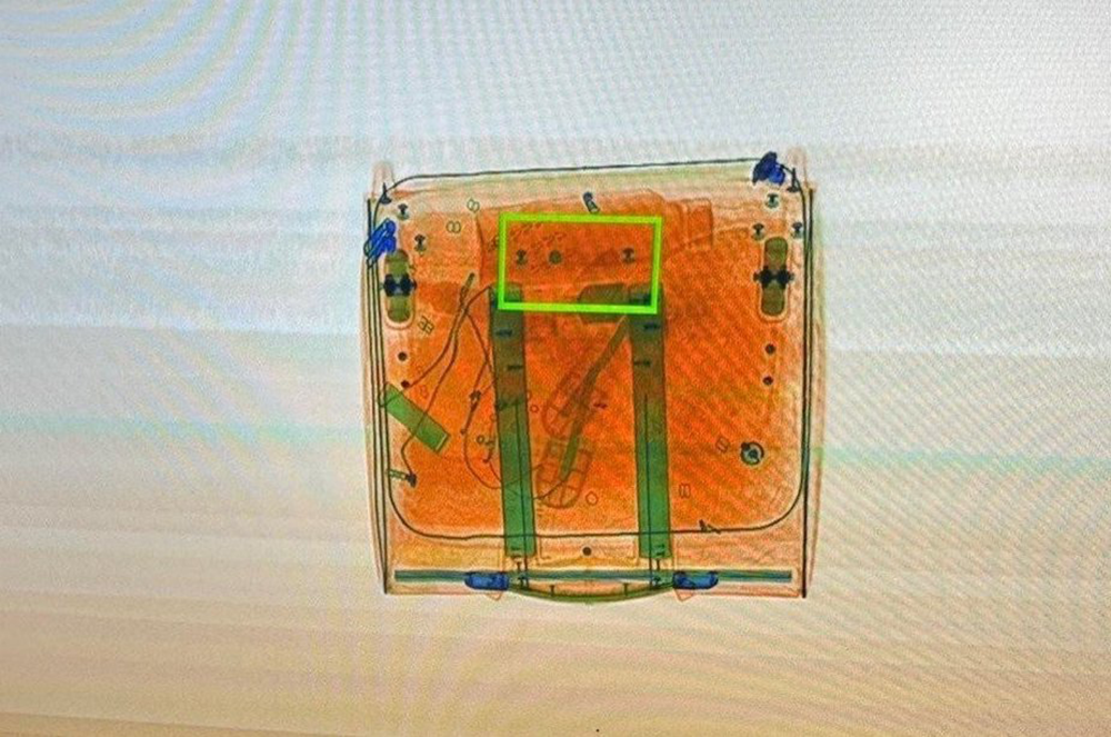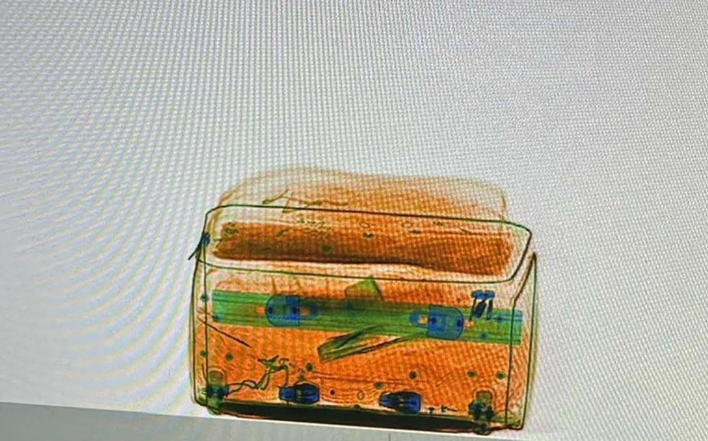 Hình ảnh soi chiếu cho thấy mặt nắp trên và mặt đáy của vali có nghi vấn cất giấu ma túy.